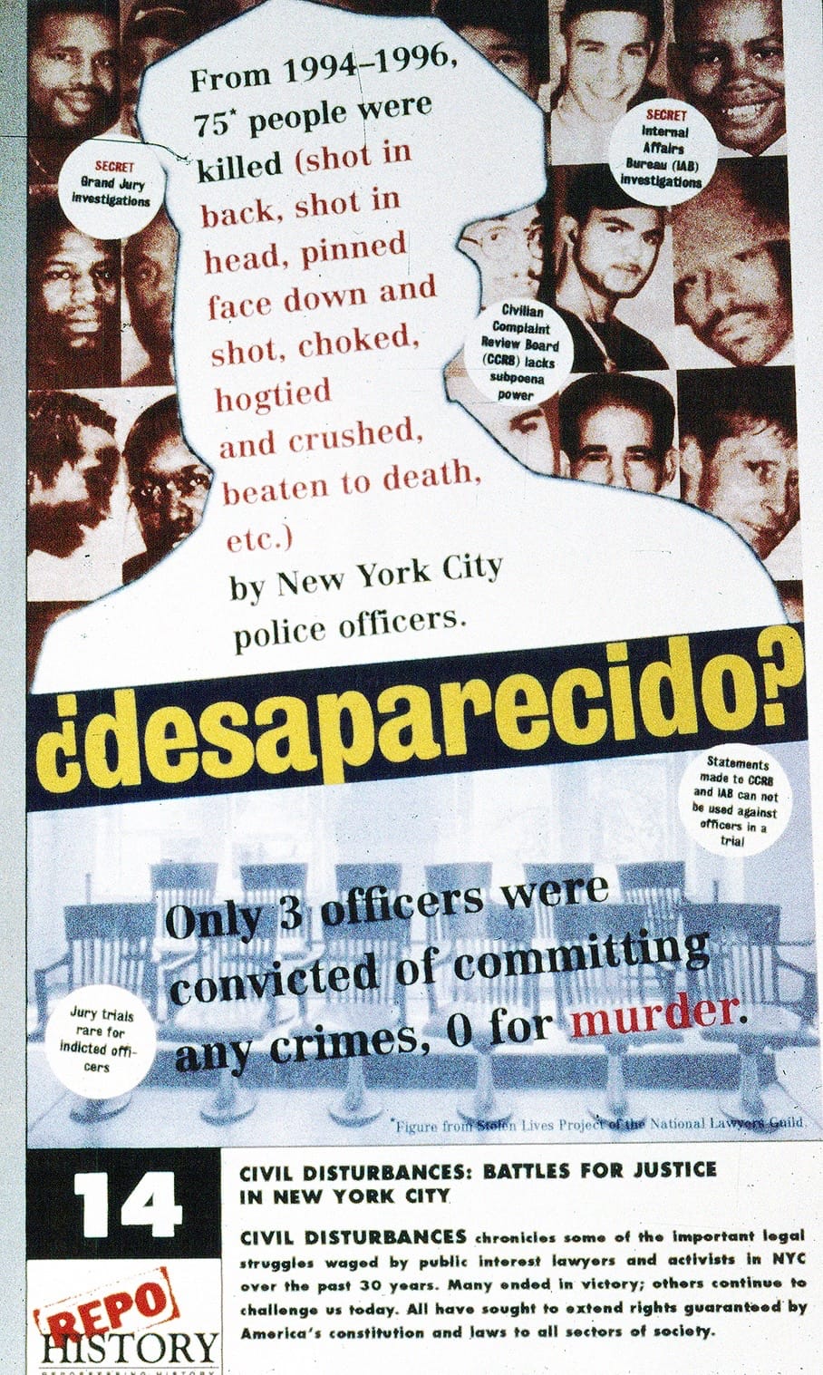 Several years later the group received Department of Transportation (DOT) permission to temporarily memorialize gay, lesbian, and trans-gendered people’s histories, this time in Greenwhich Village, with assistance from the Storefront for Art and Architecture. However, the project entitled “Queer Spaces” would be the last time that obtaining permission from the city would come easily for them. A third street sign project in 1998 was initially blocked by the Giuliani administration. “Civil Disturbances: Battles For Justice in New York City” was produced in partnership with New York Lawyers for the Public Interest. Its objective was to mark sites where significant legal confrontations led to the extension of civil rights for the politically and economically disfranchised. REPOhistory marked the firehouse at 250 Livingston Street in Brooklyn where Brenda Berkman worked after winning a lawsuit to become the city’s first female fire fighter, and one African-American group member who had been part of a de-segregation court case in New York posted her sign about the case outside the offices of the NAACP’s Legal Defense and Educational Fund on West 40th Street. Meanwhile, several other signs directly decried the NYPD’s history of misconduct and violence towards people of color. Carrying ladders and installation tools the DOT faxed a note informing REPOhistory it was not to carry out the project only moments before its commencement. “Now the signs may end up in the very courthouses that inspired them,” wrote David Gonzalez in the New York Times the next morning.