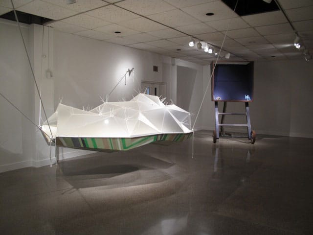 In “Every Death a Nap,” the pale horse, death, becomes sleep. A pillowy, translucent and cream-colored tent-like structure hangs from the ceiling. Part cradle, part bed, it holds two adults snugly (this piece perhaps gets the most use from viewers; by the end of the show it was lopsided) and appears to be ready for takeoff.