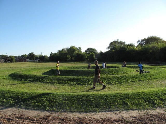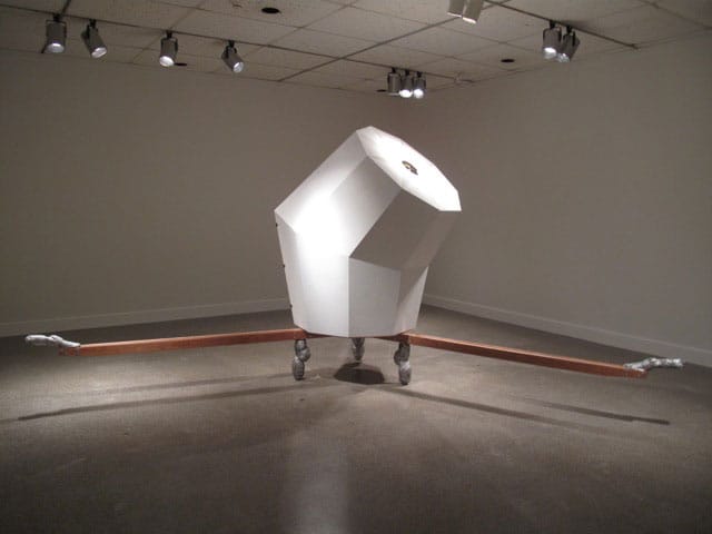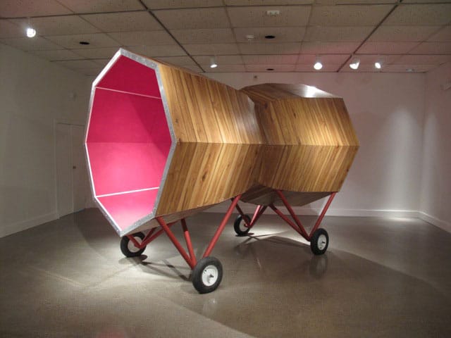 The works of sculptor Graem Whyte occupy the space between such inconsistencies. In 2009, Whyte and his wife, painter/dancer Faina Lerman, established Popps Packing, a community based, experimental art laboratory in their Hamtramck neighborhood on the edge of Detroit. Through this venue, they also produce land-based works that combine things surreal, conceptual and utilitarian. Among them: “Memory Field,” a radial grass formation in Detriot’s Calimera Park commemorating community members who have passed. Currently in production, “The Squash House,” a fire-damaged home the artists gutted and are rehabilitating into a multi-purpose space for racquet sports, gardening (yes, squash as a crop) and art shows/performances. Their project favorably recalls for me a Ghandi quote I’d previously found irritating (probably because it appeared on too many bumper stickers and Facebook posts), “Be the change that you wish to see in the world.” Here it fits beautifully. Whyte and Lerman have a relationship with art and community that is intimate and transformative.