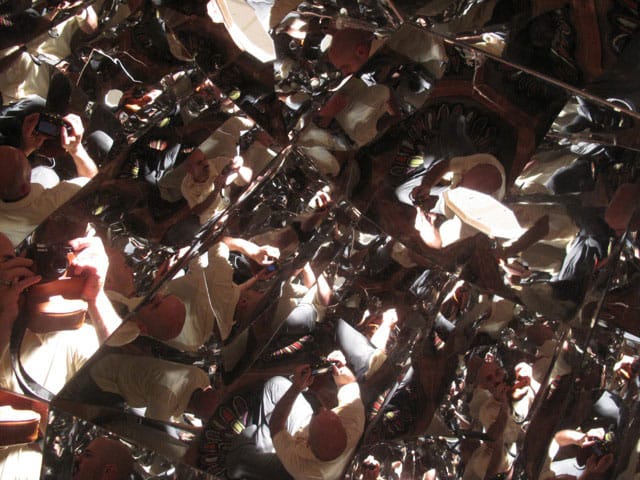 In “From One to Infinity,” Whyte turns the tale’s white horse, conquest, into enlightenment (or, as the artist elaborates, “conquest of self, not others”). It is a complex structure based on the Sedan, the ancient Egyptian chair used to convey royalty on the shoulders of slaves. It has a 9-sided footprint with 18 facets. Inside, mirrored walls insure that the one being transported cannot get away from a distorted reflection. The cube is tipped at a 42-degree angle (42 for both Detroit’s latitude and the artist’s age).