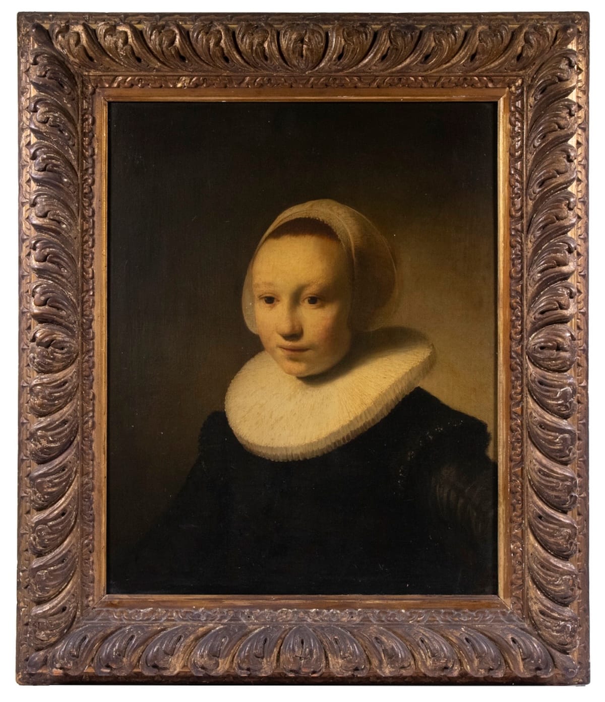 Depicting a teenage girl in black clothing with a white ruff around her neck and a translucent bonnet covering her hair, the painting was done on cradled oak panel and accompanied by a hand-carved Dutch frame with a golden sheen. Though it was unsigned, the painting has a label on the back of its frame attributing the work to Rembrandt and indicating that it had been on loan to the Philadelphia Museum of Art for an exhibition in 1970.