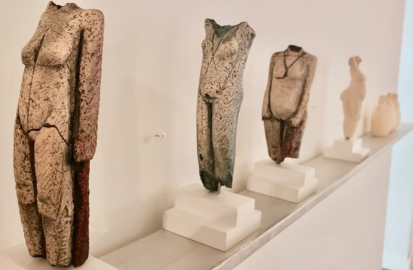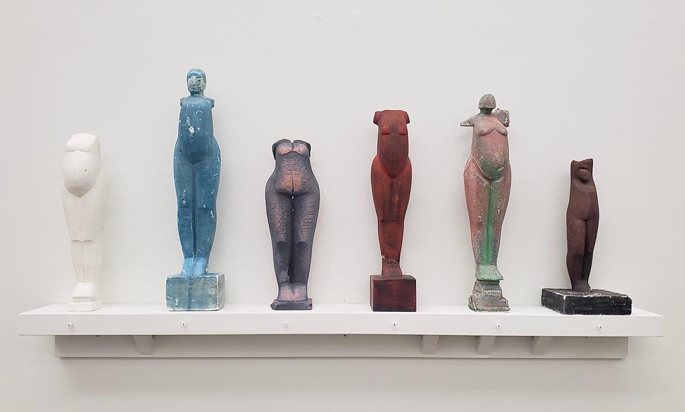 DETROIT—The image of an incomplete woman stands quite literally at the center of Rose (Brown) Dalessandro — a retrospective of the somewhat enigmatic Detroit sculptor who passed away in 2017 at the age of 77. The posthumous survey of her work highlights several of her signature motifs, mostly rendered in hand-built ceramic, or bronze and plaster relief: shields that resemble the colorful carapaces of beetles, wabi-sabi vessels, and series of female figures that appear somewhere between a mythic Amazonian ideal and the Venus of Willendorf.