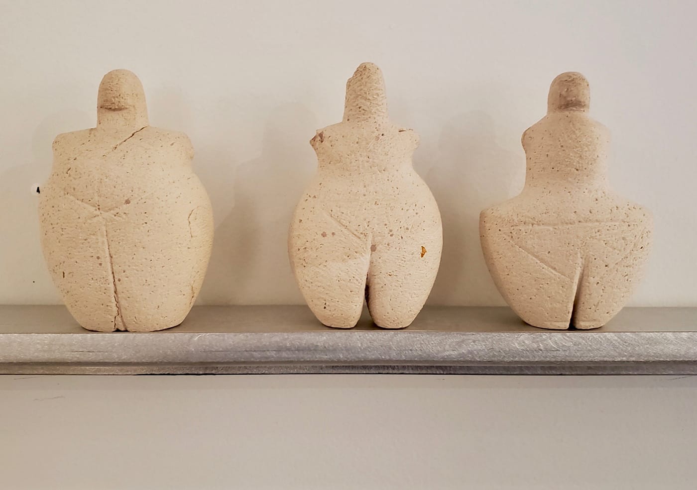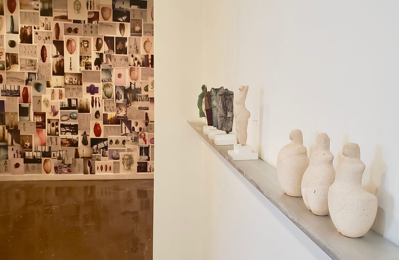 The various threads of Dalessandro’s finished works lead into the interior sanctum of Galerie Camille, where a kind of shrine to the artist’s inner life has been mounted: a wall papered in concept sketches and musings from her sketchbooks and diaries. Within these snippets, one detects the struggle faced by many a female artist: the obligations of a creative existence in a turf war with the responsibilities of a procreative existence. Just as her ceramic goddesses are born into the world lacking a full complement of limbs and features, one senses in Dalessandro’s writings an unmet desire for her fullest expression.