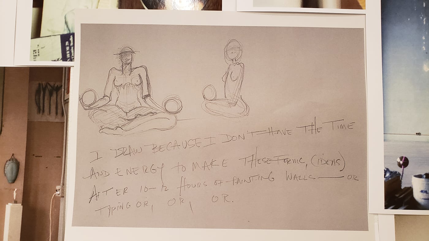 “I draw because I don’t have the time and energy to make these forms (ideas) after 10-12 hours of painting walls — or typing, or, or, or”— a short statement by the artist declares, accompanying a sketch of female figure seated cross-legged and balancing a ball in each open palm. The “or, or, or” is a recognizable lament for anyone who takes up the fight between self and others, art and life, the quotidian and the transcendent. The legacy Dalessandro leaves behind is not simply one of form, but one of the struggle attendant to its creation.