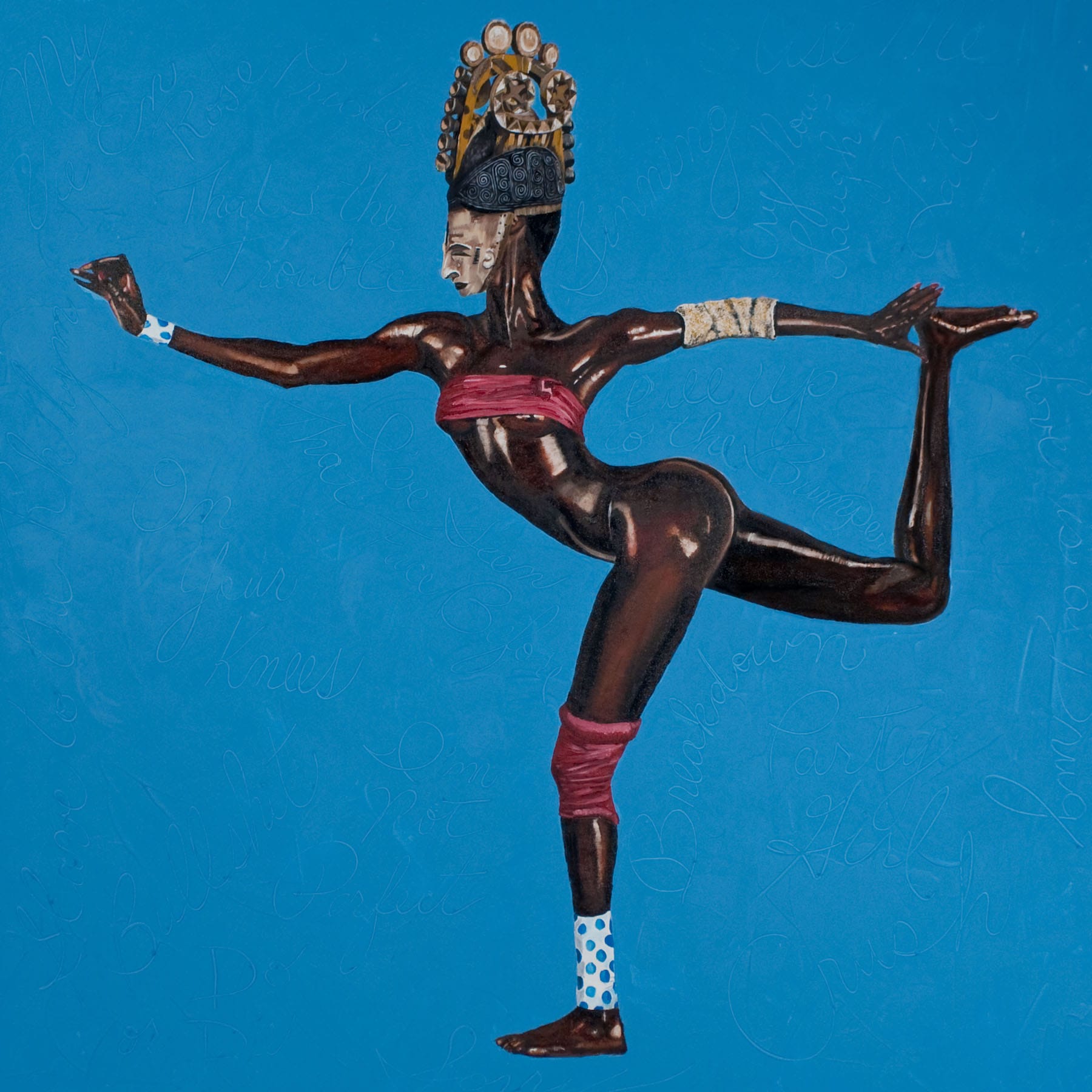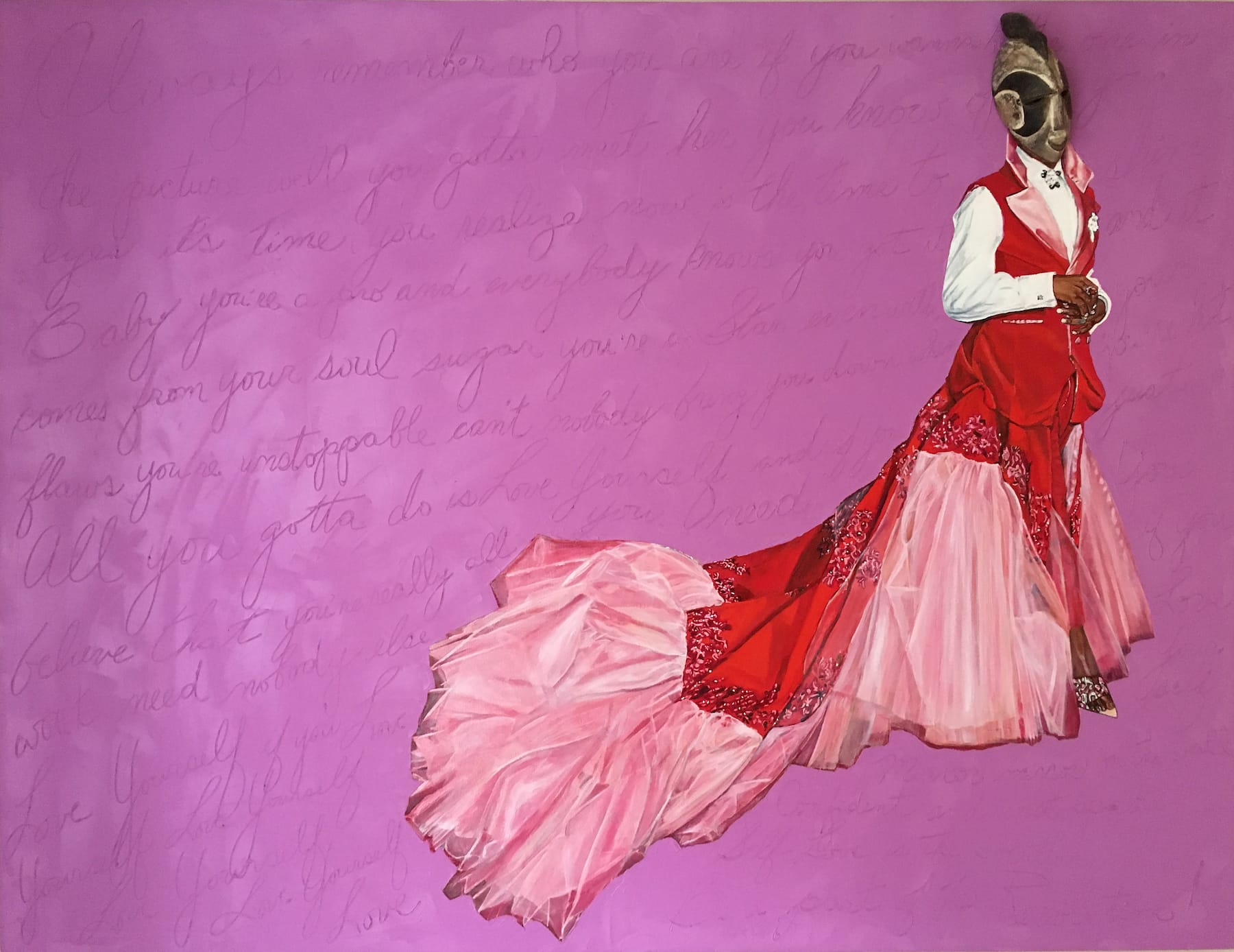 Margaret was game. In 2014, “Punu Janelle,” her then recently finished painting of Janelle Monae from her series The African Diva Project was included in the exhibition Bridging Boundaries: Redefining Diaspora. Margaret was concerned about the shipping costs, and I suggested we use the subway to transport her painting from Queens to the Postcrypt Art Gallery at Columbia University. The next day, Margaret was dressed in black, wearing a pair of hand-painted spectator shoes and fuchsia gloves, ready to take the adventure into the critical performance realm.