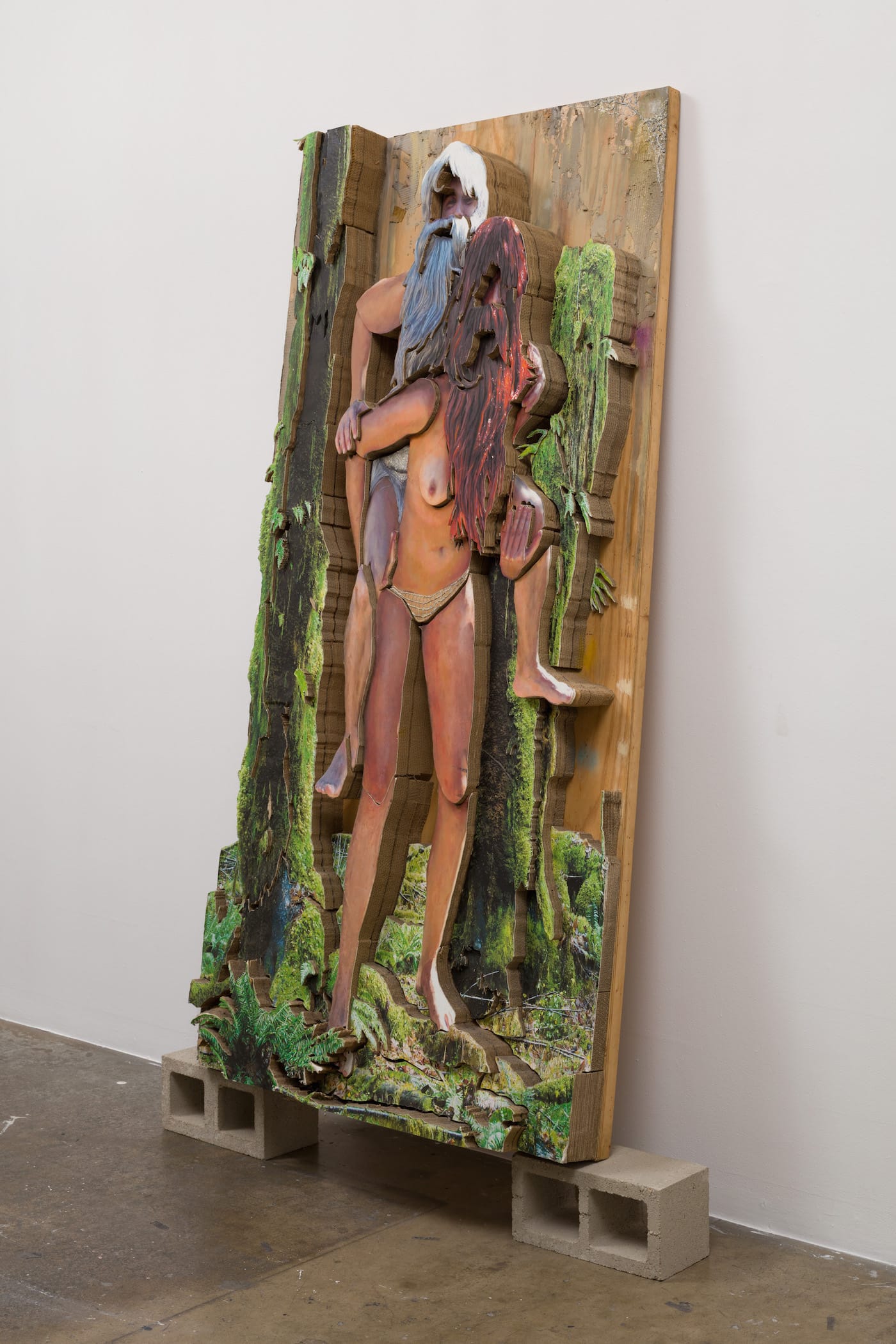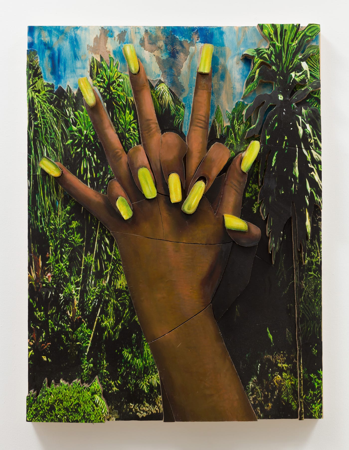 Nearly all the works on view depict lush rainforests, waterfalls, or tropical beaches — landscapes Cromarty composed from photographs she cut up, reassembled, and painted afresh. All this is secured to sheets of cardboard shaped and layered to varying depths, creating a three-dimensionality that evokes dioramas, pop-up books, bas-relief sculpture, and psychedelia. Cromarty’s pictorial structure reverses perspectival illusion — instead of the image receding into the picture plane, the topographically stacked cardboard causes the image to rush forward. The rawness of her construction may reflect the rough tumult of her personal history, challenges stacked upon challenges from an early age, which she overcame to attain an MFA from the University of California Los Angeles in 2012.
