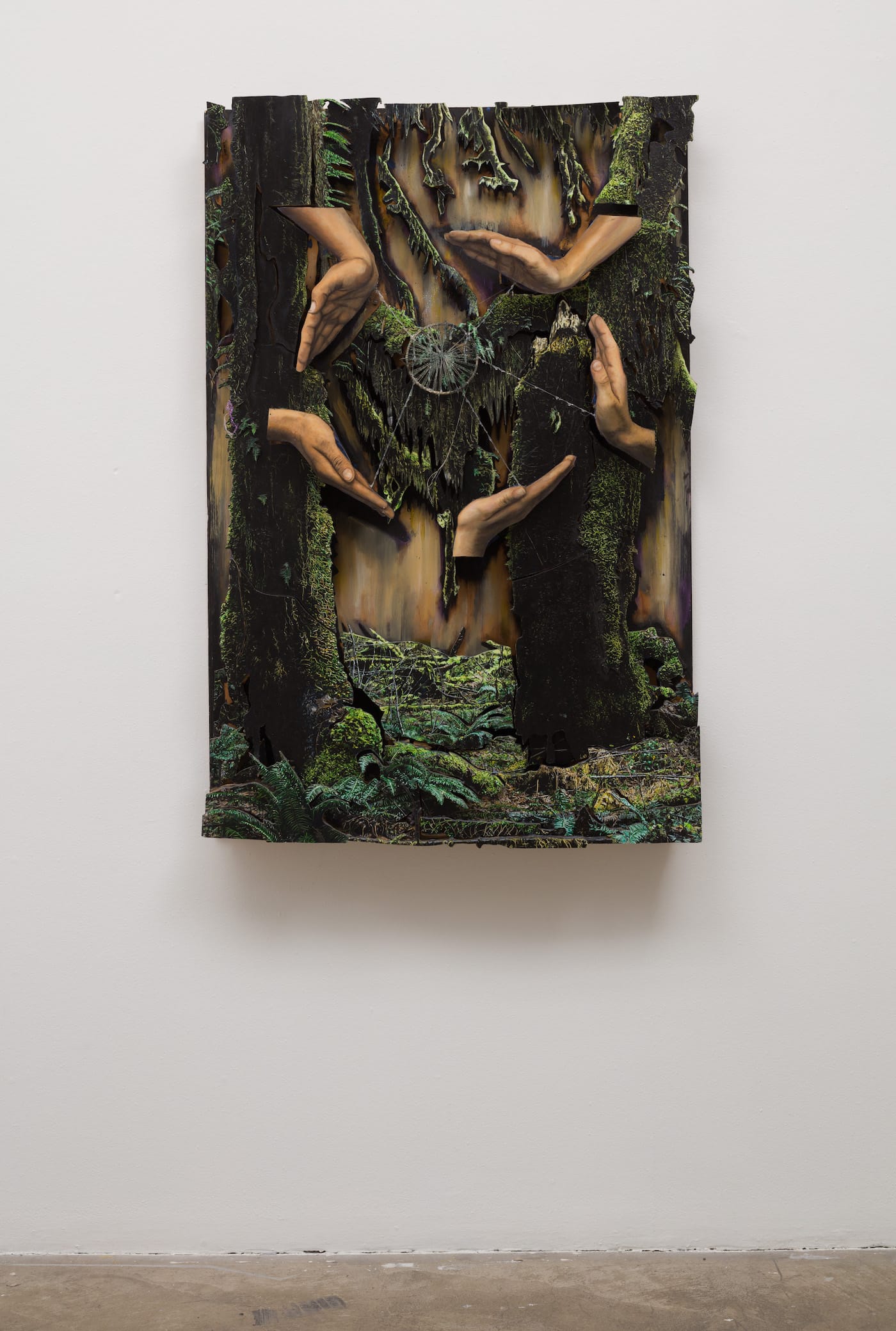 In Cromarty’s visual lexicon, nature is home to the supernatural. “The Beholders” (2015) is a vision of floating hands encircling a mysterious ring or portal deep in the jungle. In “The Guide” (2018), radiant light emanates from a break in the dense foliage, beckoning the pilgrim deeper. “Travel Eye” (2013) is a dream catcher made from leaf forms, establishing the natural world as a source of protection. I suspect Cromarty viewed the untrammeled earth in a manner similar to Van Gogh who, like Cromarty, suffered from bipolar disorder. Van Gogh’s flame-like cypresses suggest the two artists share a druidic intuition. “Gotcha” shows a pair of hands raised amidst palm trees, the fingers of the left spread up and apart like branches, with all ten fingernails painted a yellow-green attuned to the foliage, emphasizing the visual pun on the word palm. The fingers of the right hand are folded down to clasp the left in a gesture of self-possession: Cromarty at one with nature, catching herself lovingly.