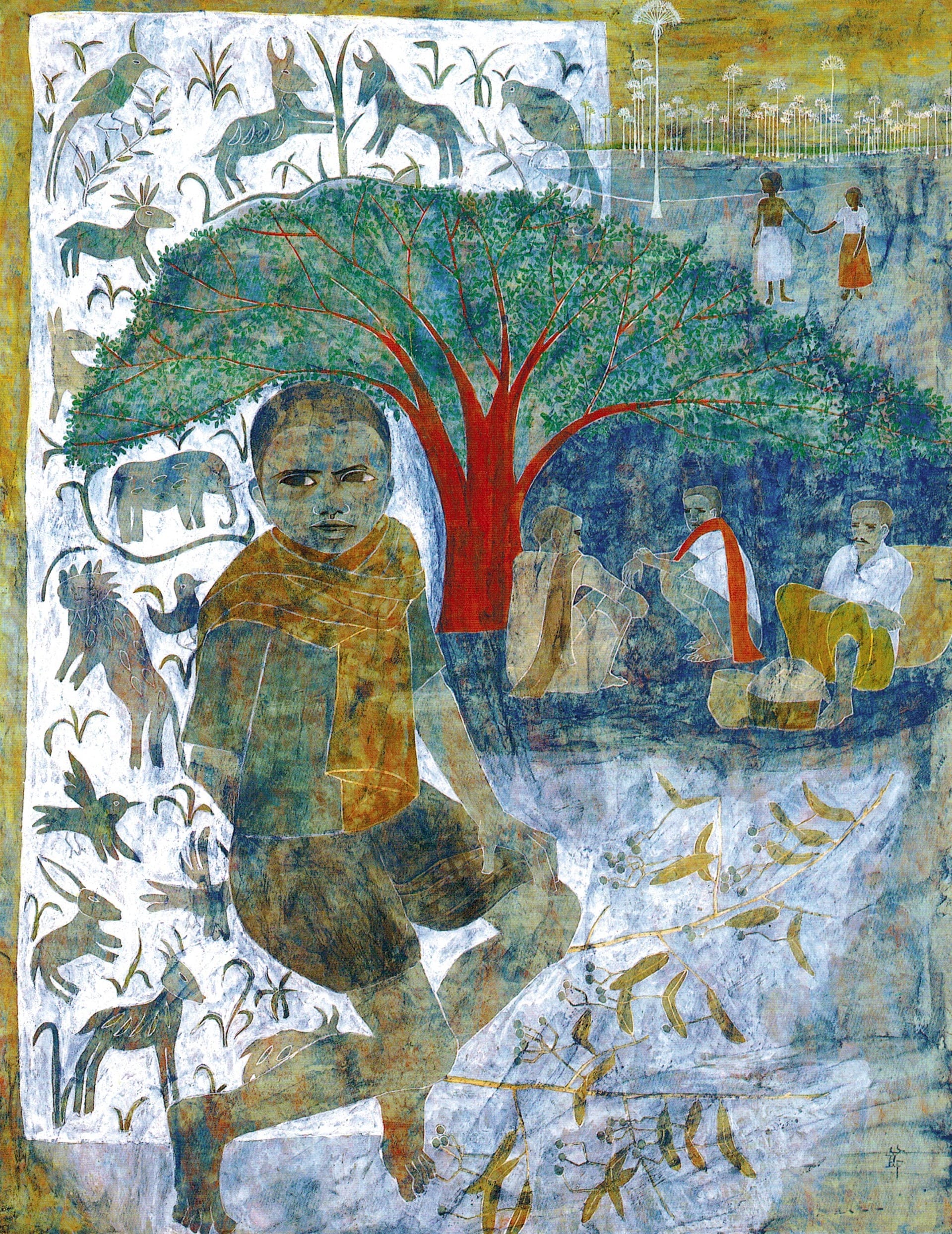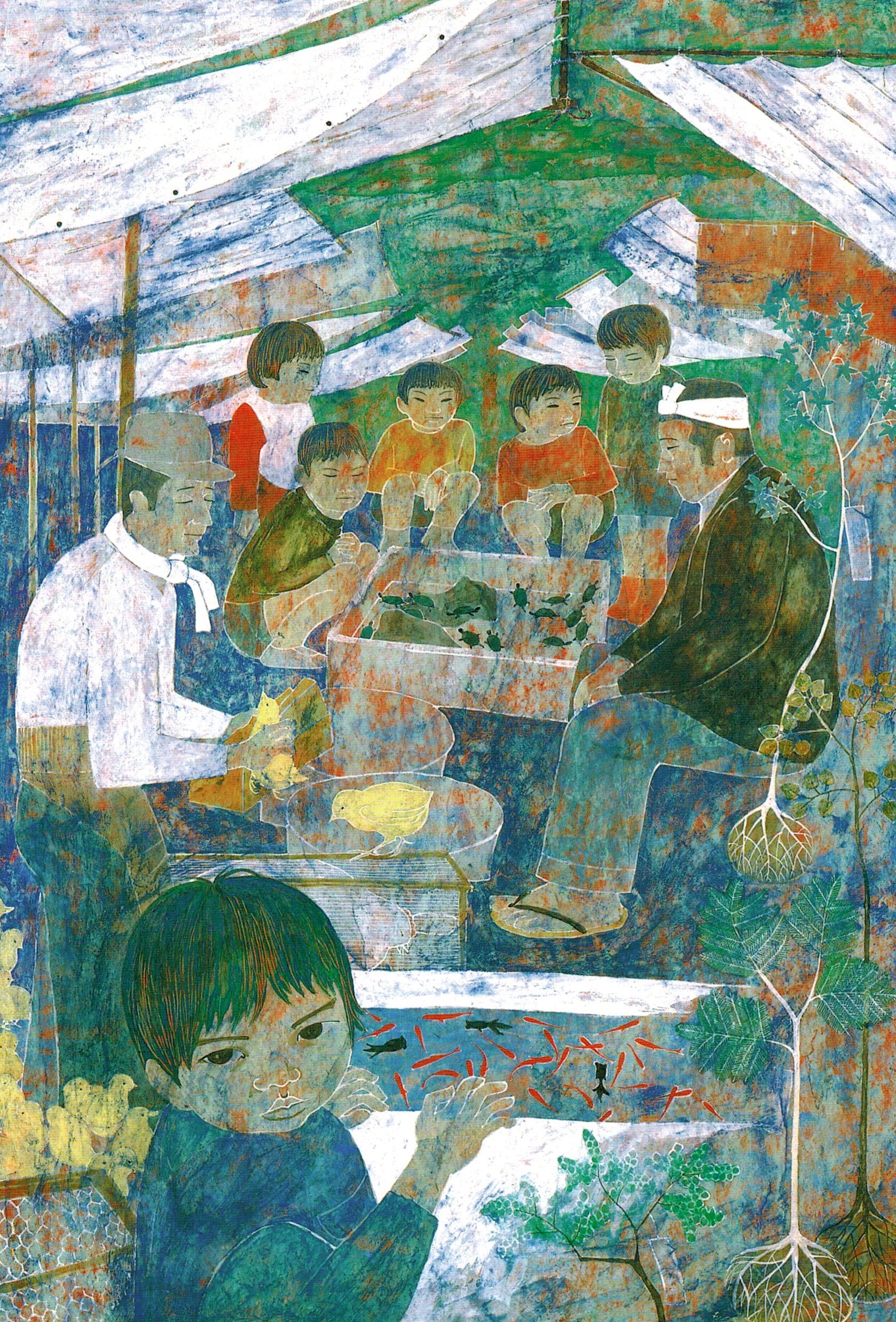 Between December 1967 and January 1968, Mitsuhashi traveled to India and Cambodia on a sketching trip with a group of other artists. Her impressions continued to inform her painting in the years after her return to Japan. In “Earthen Child” (1972), the artist collages different characters and places as if patching together distant memories. The boy’s face may be inspired by her son, who also appears in the bottom left corner of the busy market scene in “Thousand Dumplings,” painted later that same year. In both works, she shows herself to be a keen observer not only of plants, but also of regular people living their daily lives.