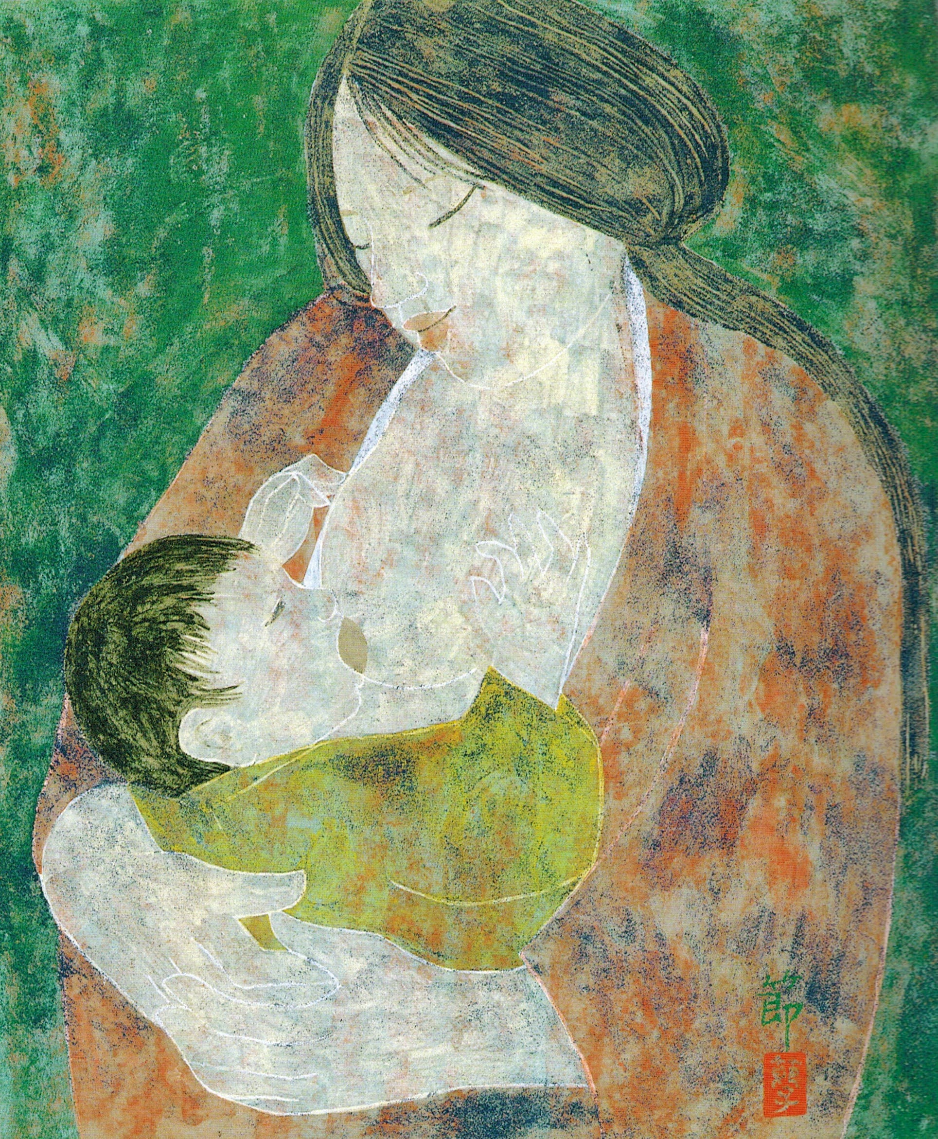 One of Mitsuhashi’s final pieces is “Mother and Child” (1974). The tender portrait is based on a sketch that her husband made shortly after the artist gave birth to her son in 1970. Here, the surface is thinner and more agitated than in previous works, and her visible brushstrokes seem to express a sense of urgency and emotion. Nonetheless, her parting gesture is one of giving, of wishing to care for her children when she herself needed a great deal of care. It’s a heartbreaking reminder of the years Mitsuhashi wouldn’t share with her children, who were only three and five years old when she passed away in February of 1975.