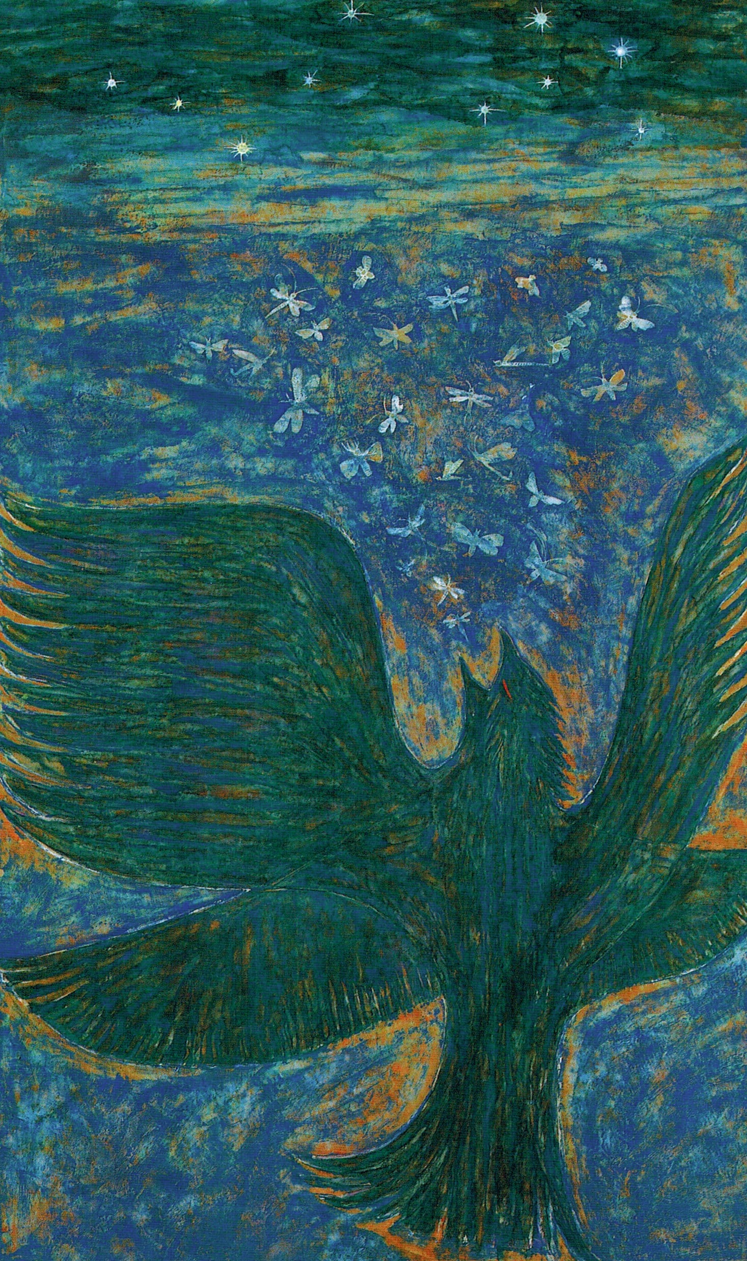 “Yodaka Star” is based on one of Mitsuhashi’s favorite fairy tales, “Yodaka no Hoshi” (1971) by Kenji Miyazawa. In the story, a lonely, ostracized nighthawk flies into the sky until he becomes a star. Like Mitsuhashi herself, the bird embodies a mixture of sacrifice and self-knowledge. Here he is depicted at the pivotal moment when he decides to no longer consume insects or other creatures and instead to leave Earth. The swooping, gestural brushstrokes convey the nighthawk’s torment, but his red, glowing eyes indicate a sense of strength.