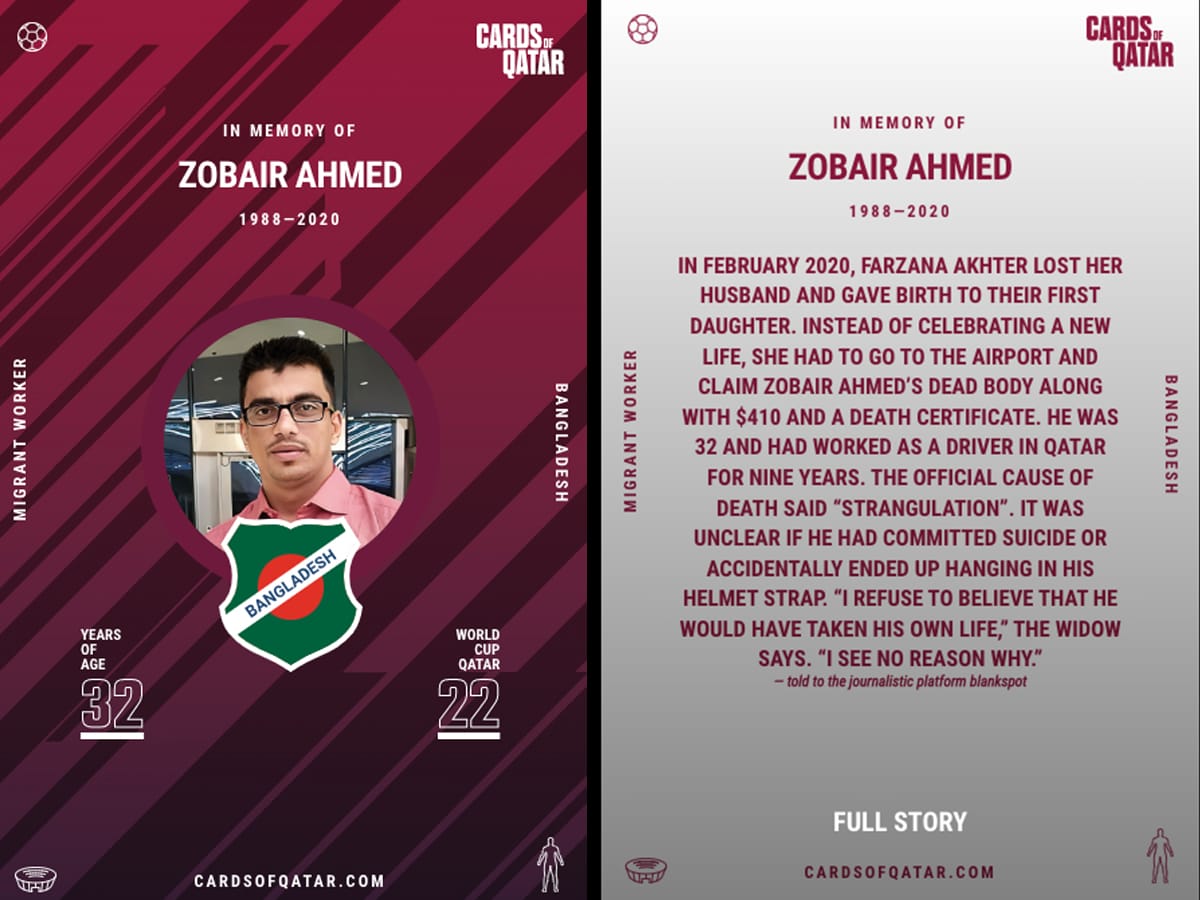 Each card is accompanied by a profile in which loved ones recount what they were told about workers’ deaths and the economic circumstances that led them to go to Qatar.