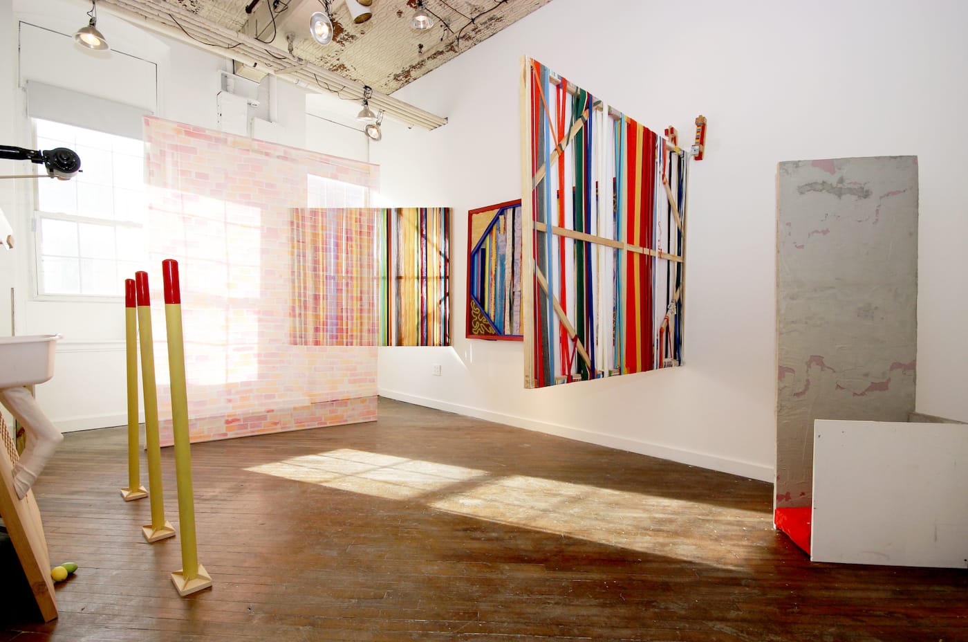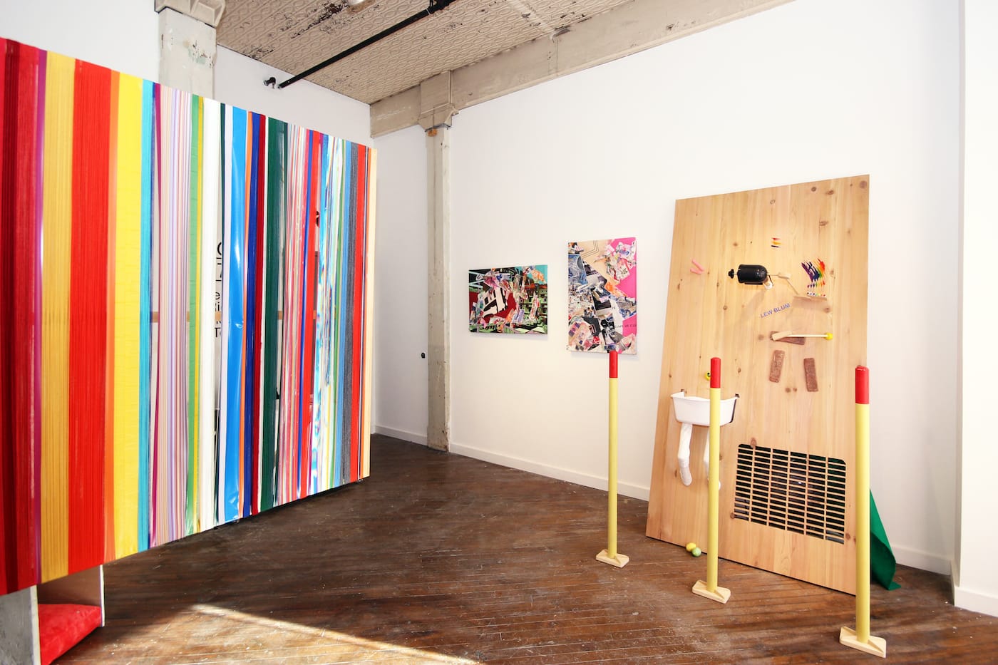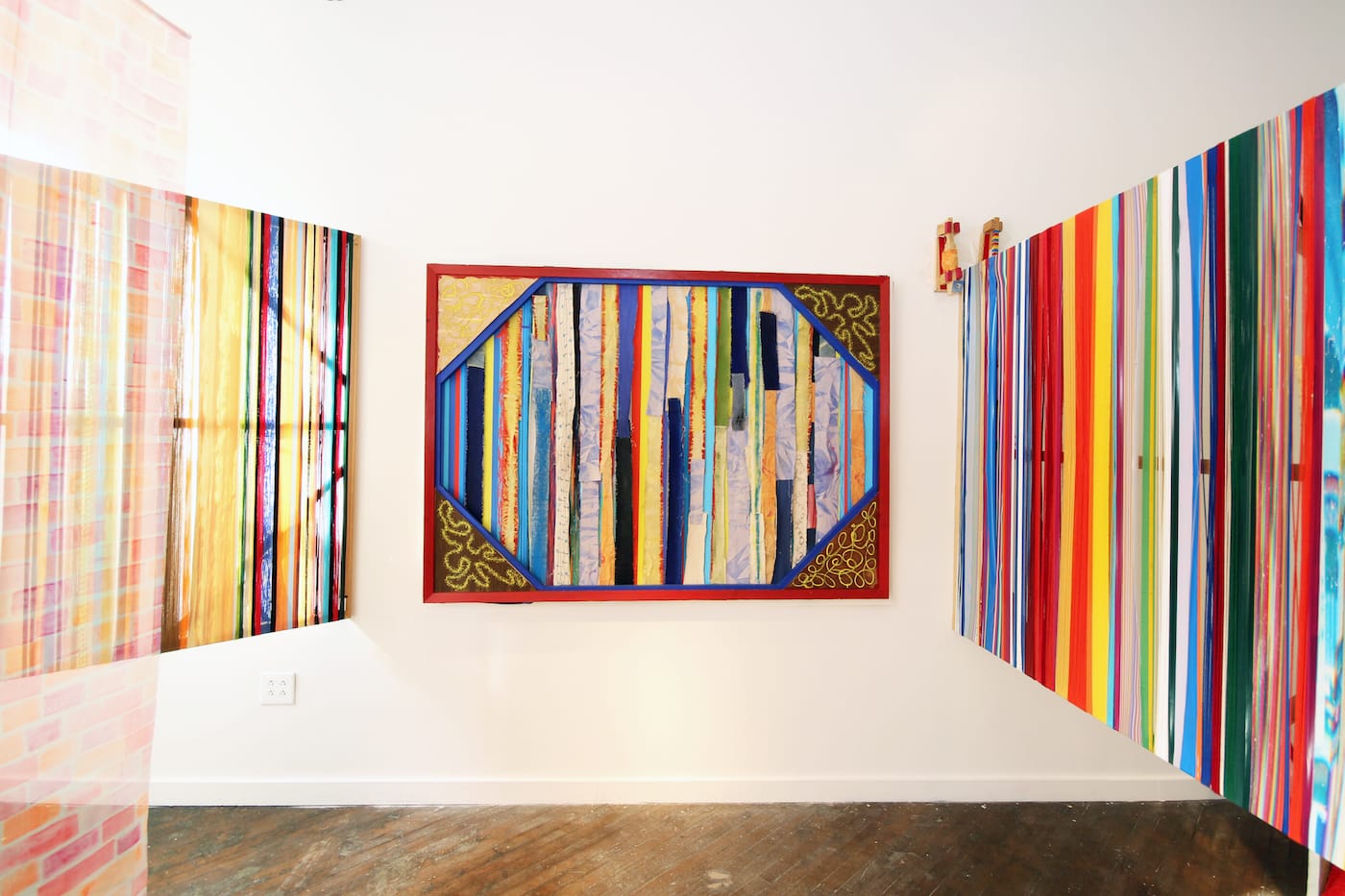 Along the right wall, there are three large framed textile works by Christopher Richard. In “Puppet Theatre” (2016), the title adds depth to the richly colored textures of cloth and plastic tape that run vertically in a shabbily ornate frame. The strips, which have the bygone feel of seventies and eighties clothing and interior design, form a makeshift curtain, waiting to be lifted so that the show can begin. In the upper right corner of the frame, there is a patch of slick brown material with a garland of tiny yellow flowers. It’s a nice touch for a work that operates as visual abstraction while simultaneously inviting viewers to imagine a puppet show. In each piece, Richard displays an acute understanding of how to play smaller details off the larger image.