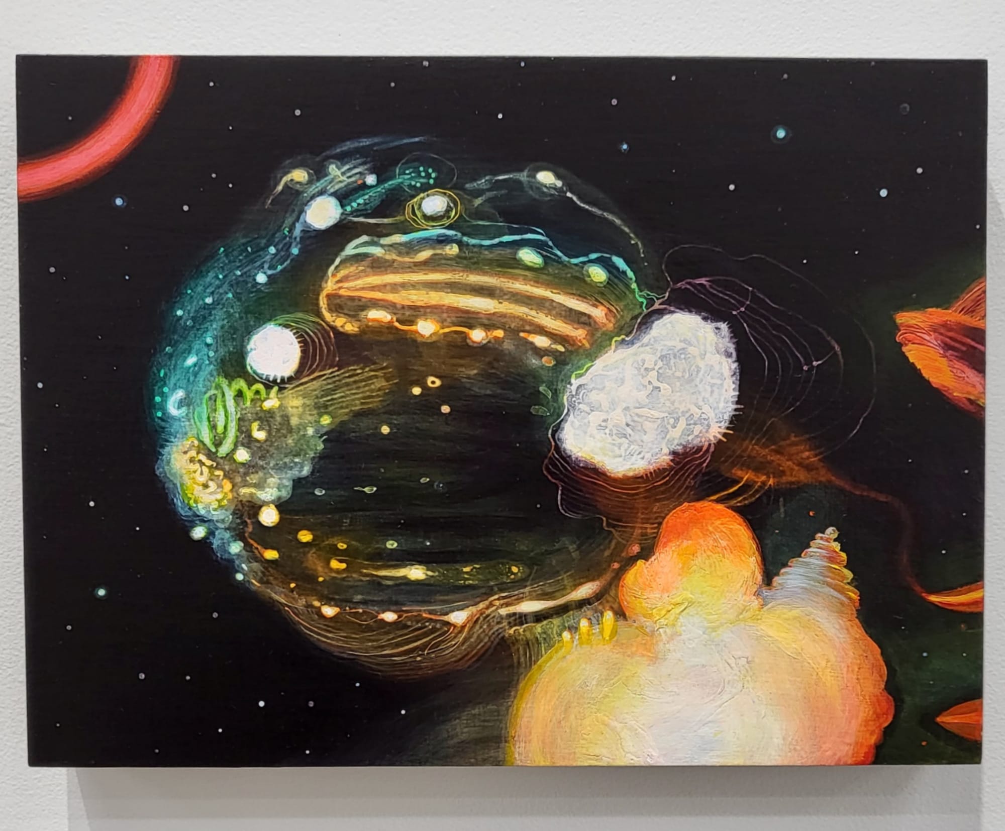 In the second iteration, there are more paintings. Some like “The Alchemy of Healing" (2019) or "Wall, with List" (2014) function as recipes with a list of substances that might treat nagging insomnia or chronic arthritis. Others such as “Come Back Gil (Scott-Heron) #3” (2021) depict colorful, abstract blobs in a dark background pick-pocked with stars, as if to draw a visual record of an interstellar event. And other paintings look like charts or diagrams.