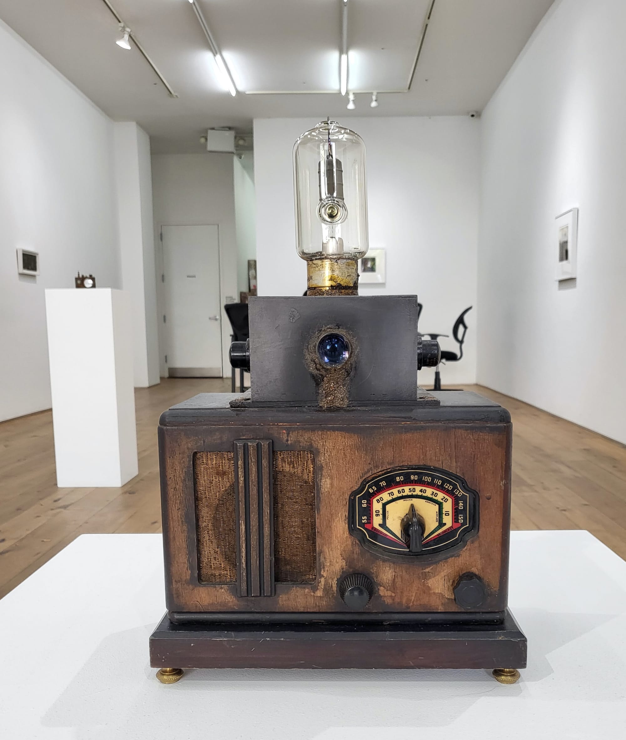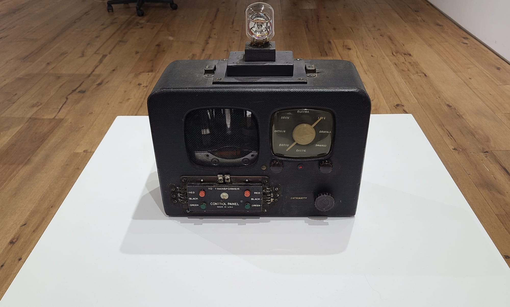 For example, her “Root Dispenser” (2013) looks like an old-fashioned pre-war vending machine, but this one offers, among others, Yucca Root, Orris (Love) Root, and High John the Conqueror Root. Except that it doesn’t really. I find out that the box doesn’t open; it doesn’t dispense any of the visible contents, and in fact, the façade is hand-painted by Stout to look as if it were stenciled. She has a lovely hand for this work which is very much about tricking the eye. Her “Spirit Selector” (2014) could be the work of a Caribbean cyberpunk root doctor who survived the coming cataclysm and began resurrecting religious practices ad-hoc using tech from the mid-20th century. The front has the terms “Transformer,” “Control Panel,” and “Intensity,” and two dials presumably connected to two compass needles that can point to different spirits: Ghede, Shango, Ogun, Elegba. What exactly would one tune into and turn on with this machine? Would the dial work like an analog radio tuner so that manipulating it might summon the faint sounds of the loa? Perhaps fiddling with it would produce an apparition, floating just above the selector? I have no idea, but the possibilities are tantalizing.