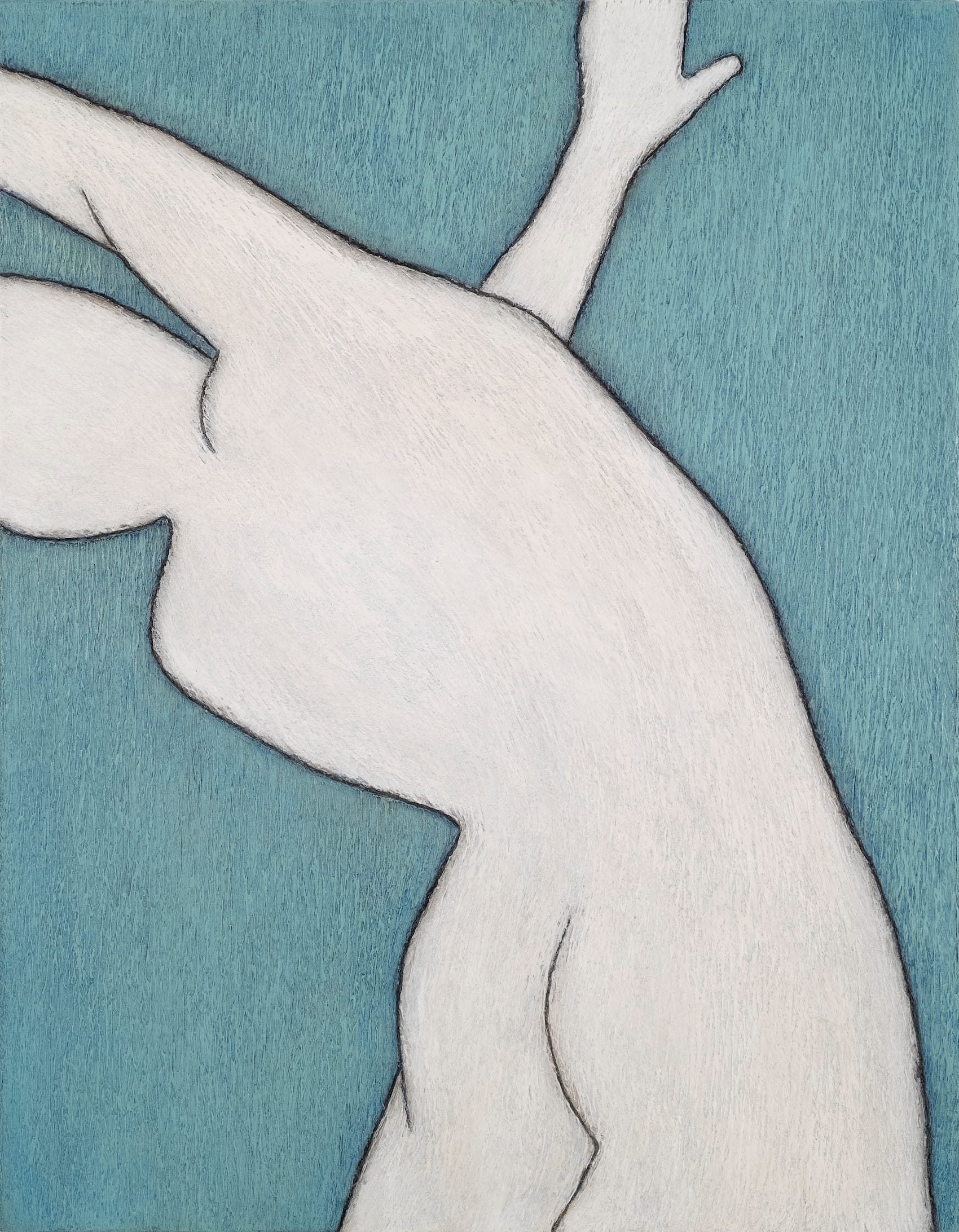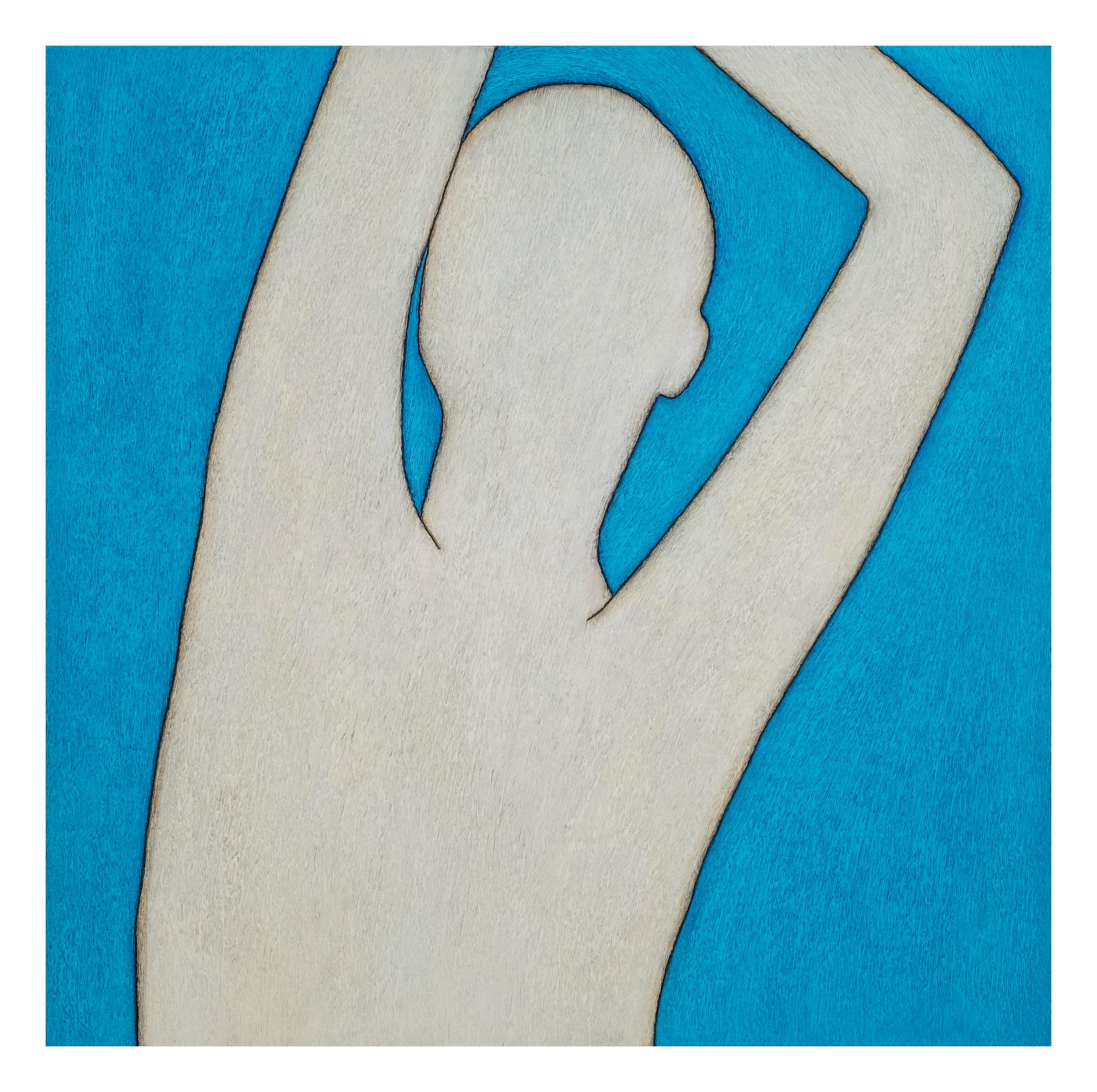 Flanking this central work are two smaller wood canvases, each with a detail of a body in motion, richly textured with a scraped, gradated background of cool hues. In “EINSAH” (2019) the cropped figure — curved lower back, bare buttocks, arms reaching toward the sides of the canvas — is suspended in a sea of oxidized-copper cyan. For “A’ASA” (2019), the figure’s arms are at rest on their head, hands draped peacefully, body surrounded by the calm of a low-intensity pale blue. A rising energy comes forth through the line’s expression of motion.