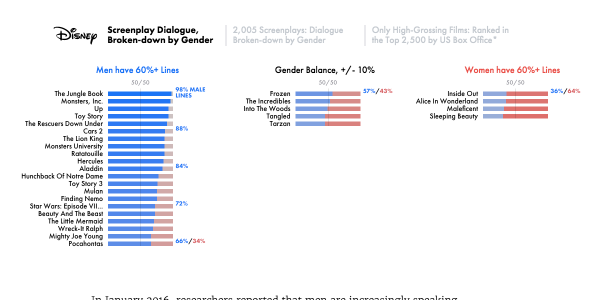 - After looking at 2,000 scripts, 25,000 actors, 4 million lines, and analyzing them by gender, this is what Hanah Anderson and Matt Daniels (writing for the Pudding) found: