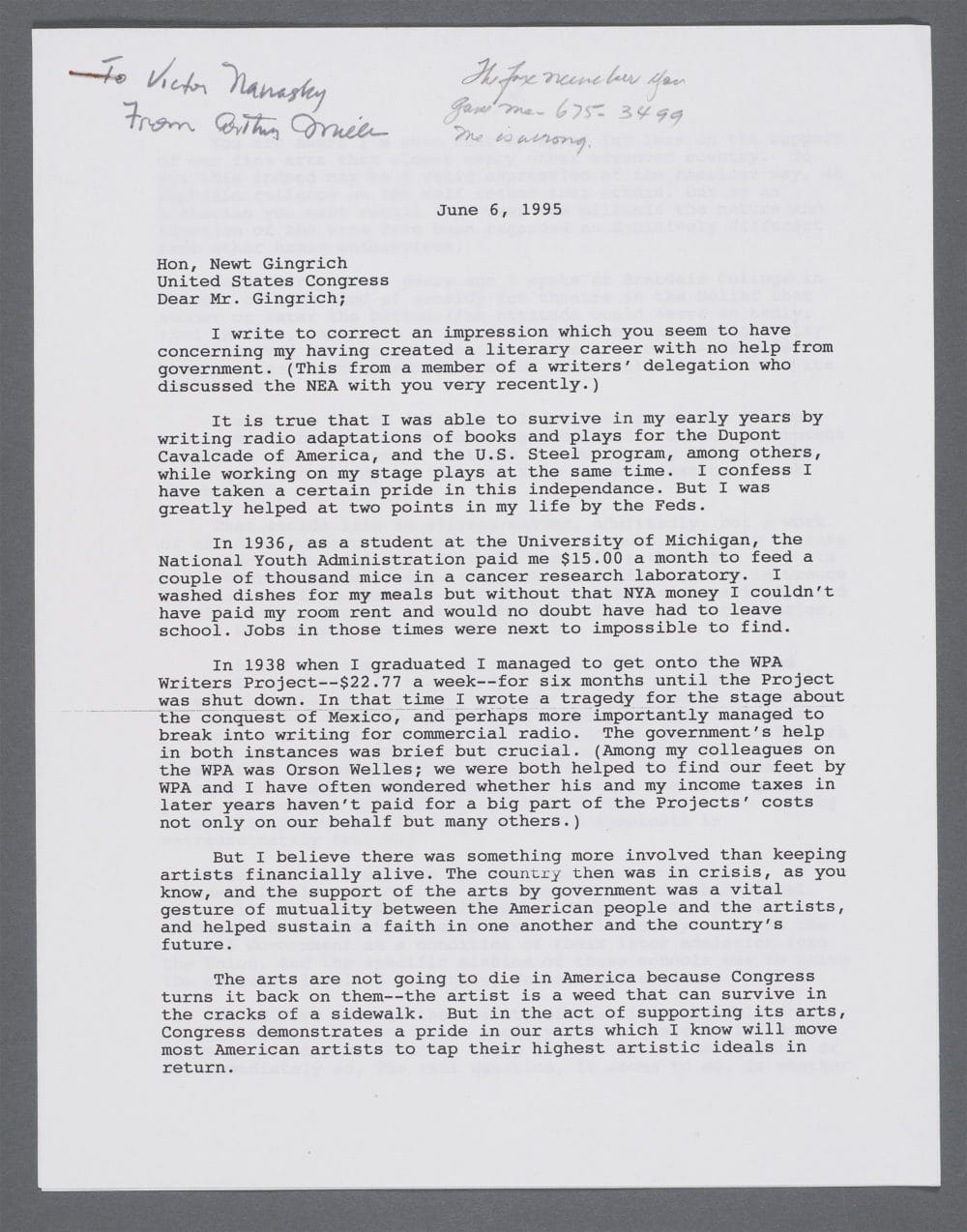 - Arthur Miller wrote a defense of the National Endowment of the Arts in 1995. It was addressed to Newt Gingrich (The letter is courtesy the Harry Ransom Archive at the University of Texas at Austin, and first published at The Nation, then Paris Review):