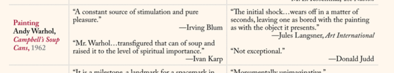 - I love vintage art reviews that get it wrong, like these mixed reviews of Andy Warhol’s Campbell’s Soup cans: