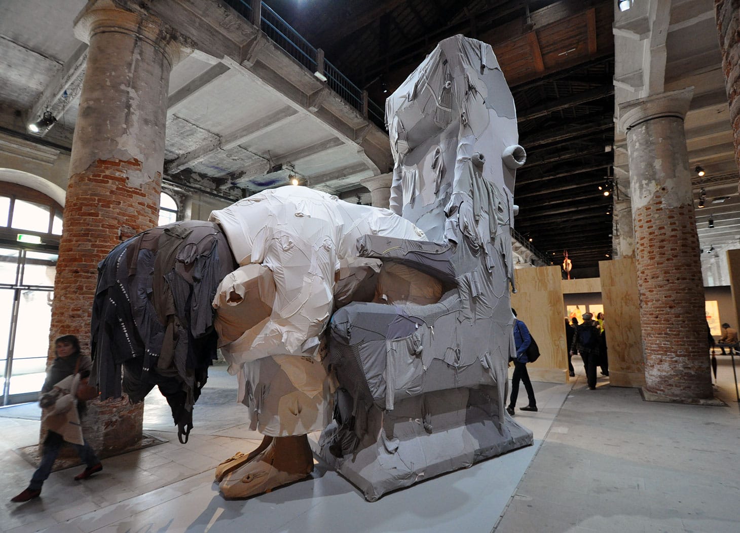 Yin Xiuzen’s large “Trojan” (2016–17) is made of used clothes on a steel frame. It is one of the most eye-catching works at the 2019 Venice Biennale that opens this weekend. (photo by the author for Hyperallergic)