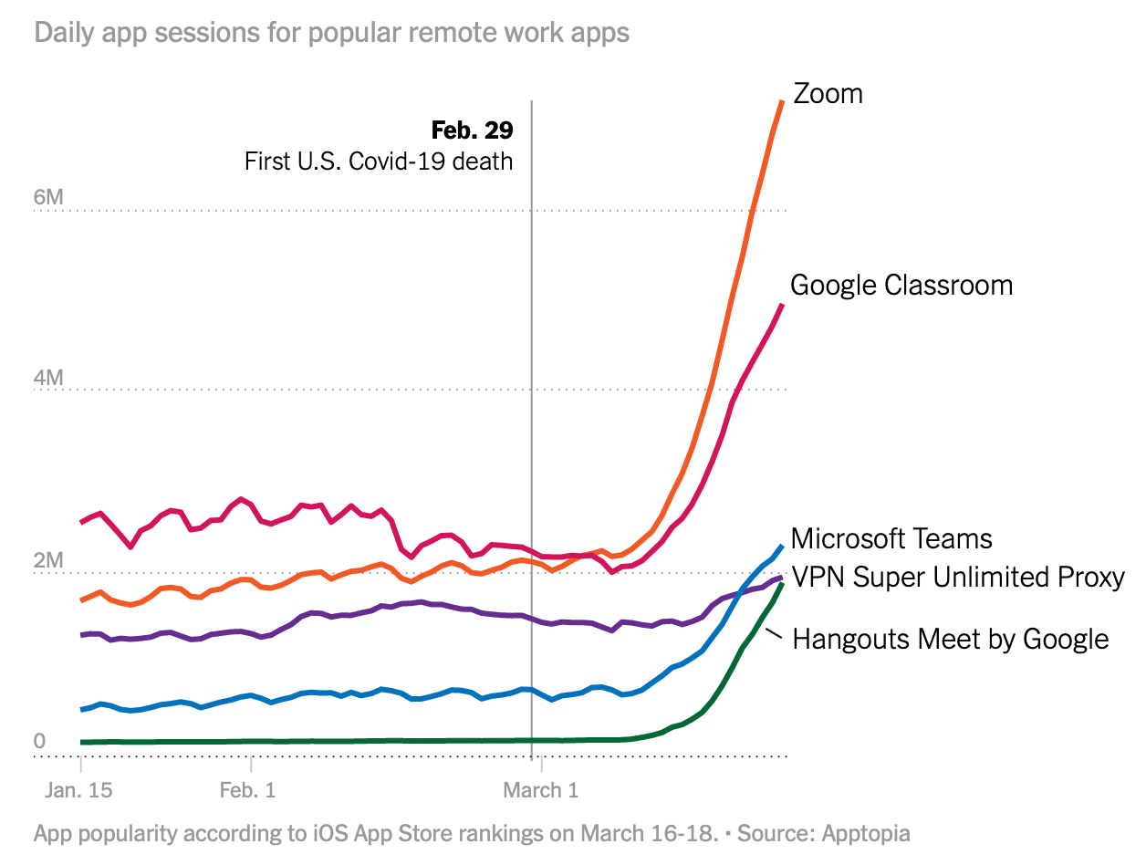 - The New York Times looked at how the pandemic and stay-at-home orders have changed internet behavior. Overall, app-use is mostly the same, while website use is very much up. And check out this graph about popular remote working apps. Zoom is clearly the biggest winner: