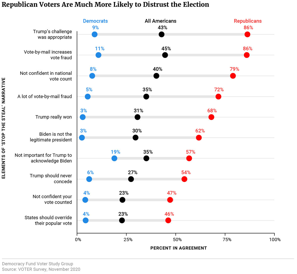 - Republican perceptions of the election are terrifying. Voter Study Group, which is a part of the Democracy Fund charitable foundation created by eBay founder Pierre Omidyar, revealed the following: