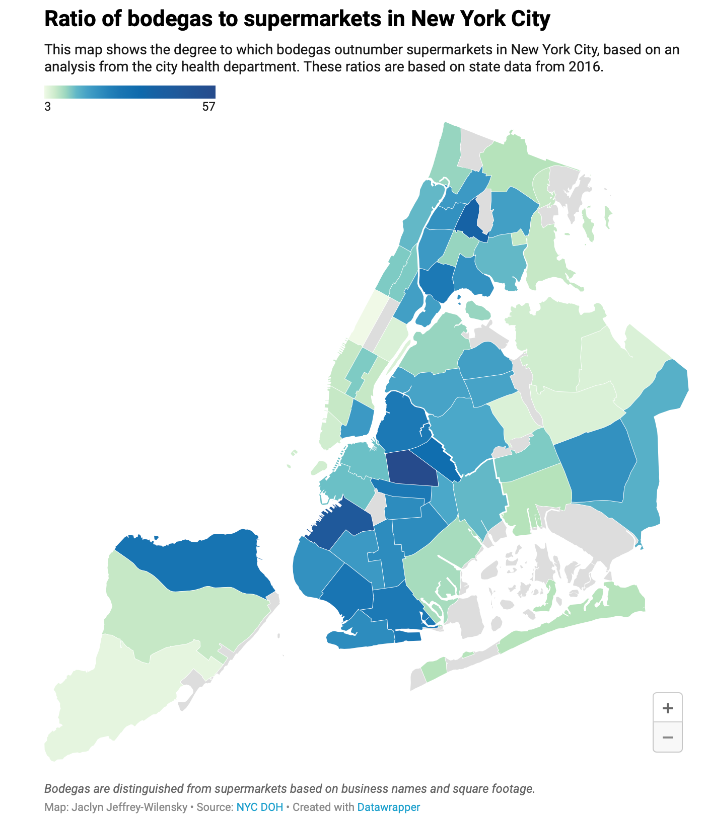 - Jaclyn Jeffrey-Wilensky, writing for Gothamist, explains that the ratio of bodegas to supermarkets in NYC is very telling (any guess which neighborhoods have a higher percentage of bodegas?). Read the whole article but this map is wow: