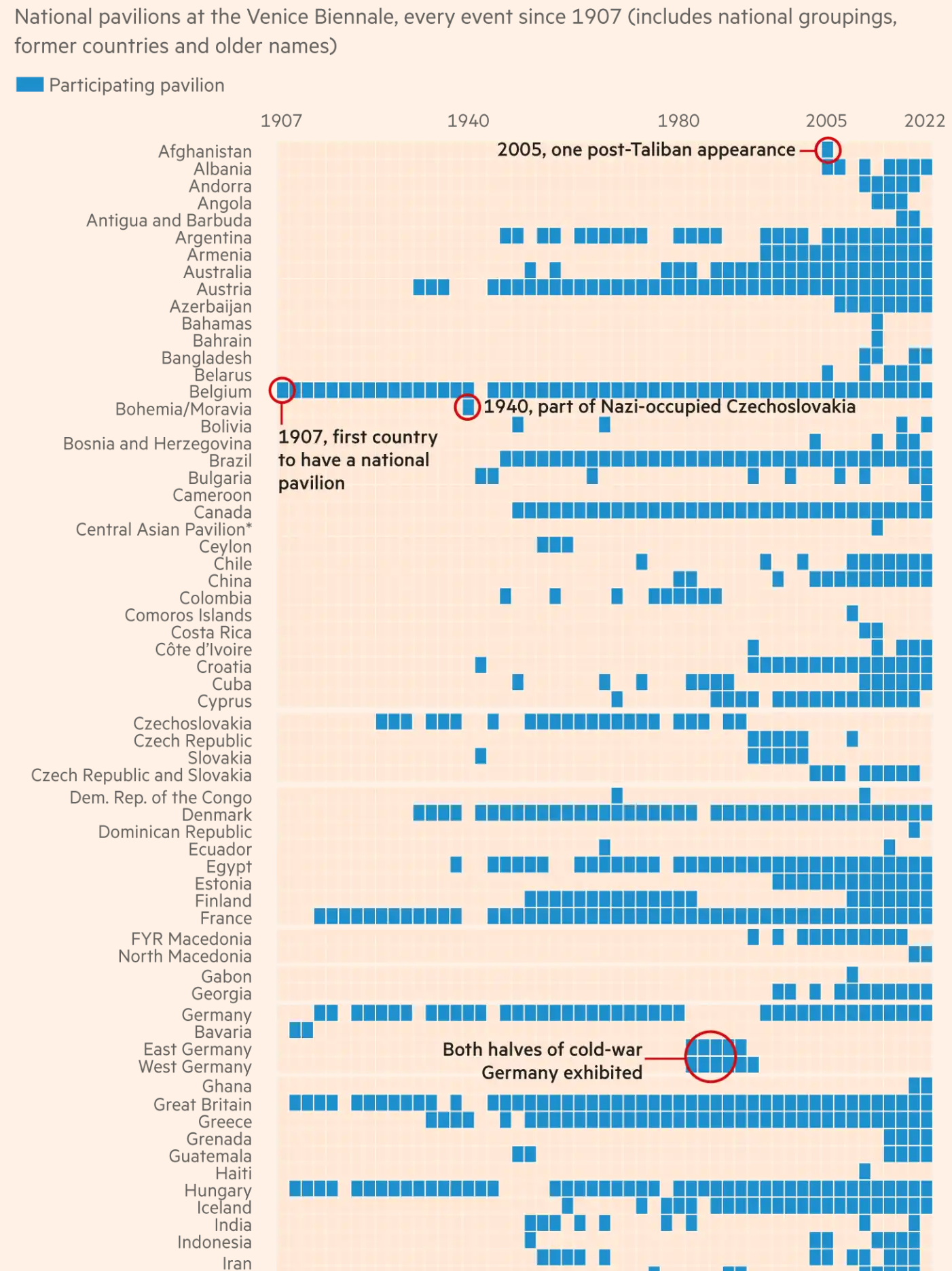 - The Financial Times has a fantastic graphic illustrating national participation in the Venice Biennale through the years. This will be the first year Nepal and Namibia will exhibit in the global art event (here's part of the larger graphic):