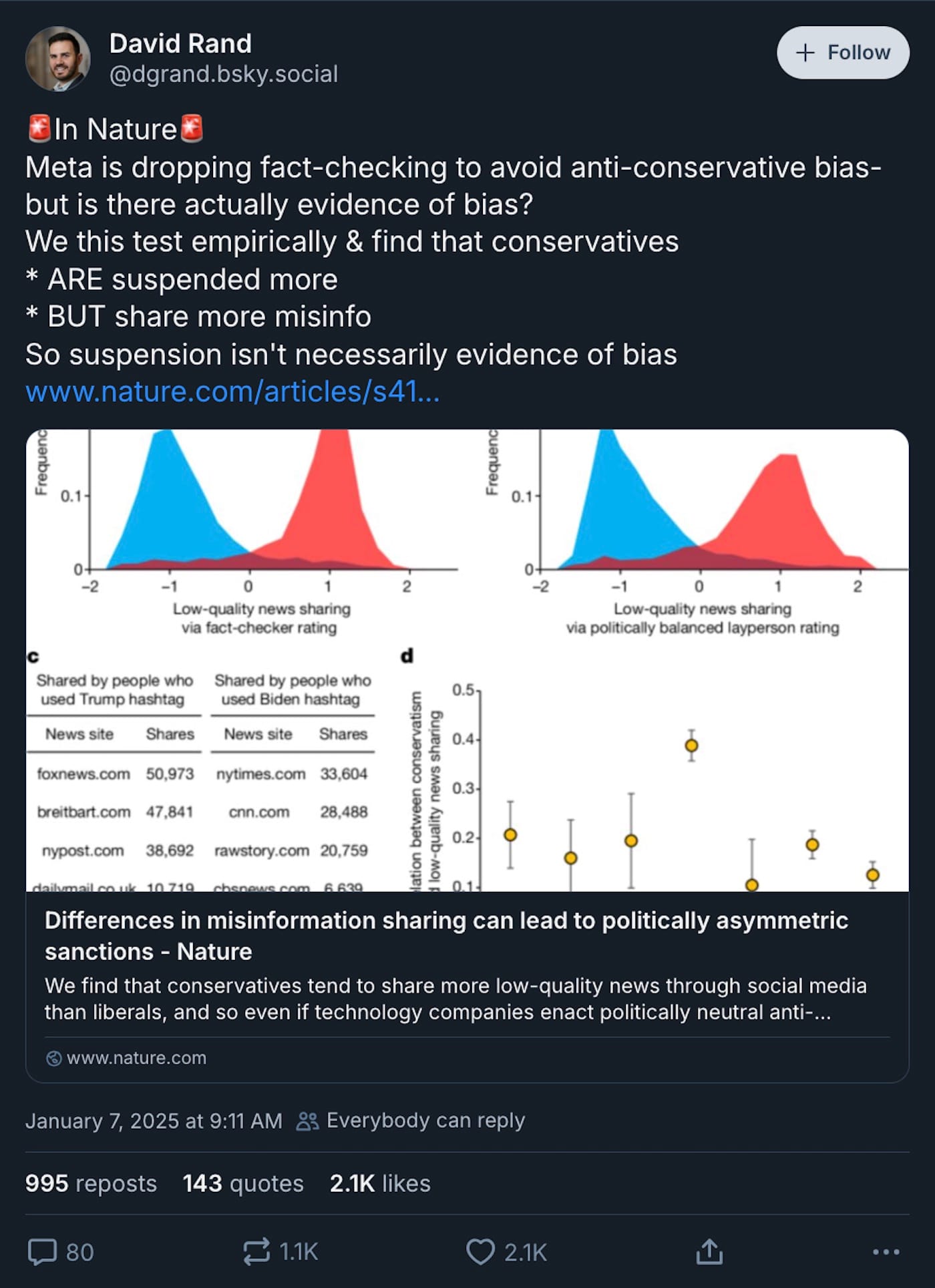 ‣ Mark Zuckerberg just announced that Meta is getting rid of fact-checking ... weeks before Trump's inauguration. Shocker! A new Nature study disproves his claim that anti-conservative bias is causing censorship across platforms, explaining that suspended conservative accounts share quantifiably more misinformation: