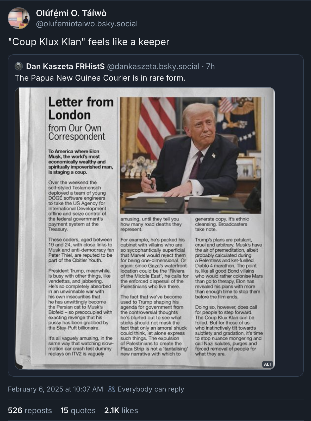 ‣ The way the Papua New Guinea Courier is both funnier and has more of a backbone than most American publications right now: