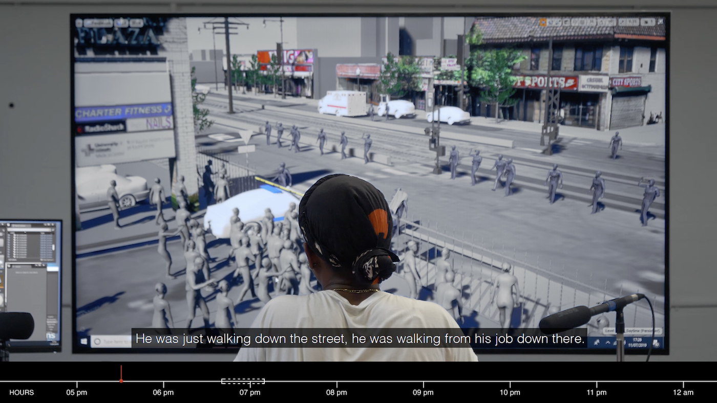 Accordingly, the project includes a recreation of what Augustus might have seen in the seconds before he was shot by officer Dillan Halley. And we also get a clearer sense of how the CPD strategically spread information about the shooting. Within 24 hours of the incident, CPD released a statement portraying the barber as “exhibiting characteristics of an armed person” and body-camera footage showing the officer Dillan Halley shooting Augustus. The video was published online with the title “Aggravated Assault to a Police Officer” and included a freeze-frame of Augustus, who can be seen wearing a holstered gun.