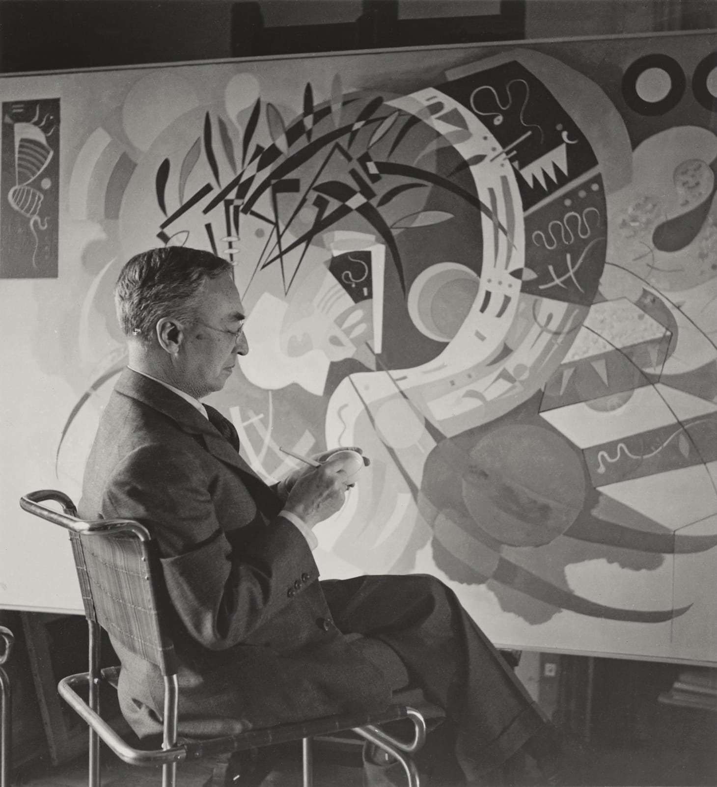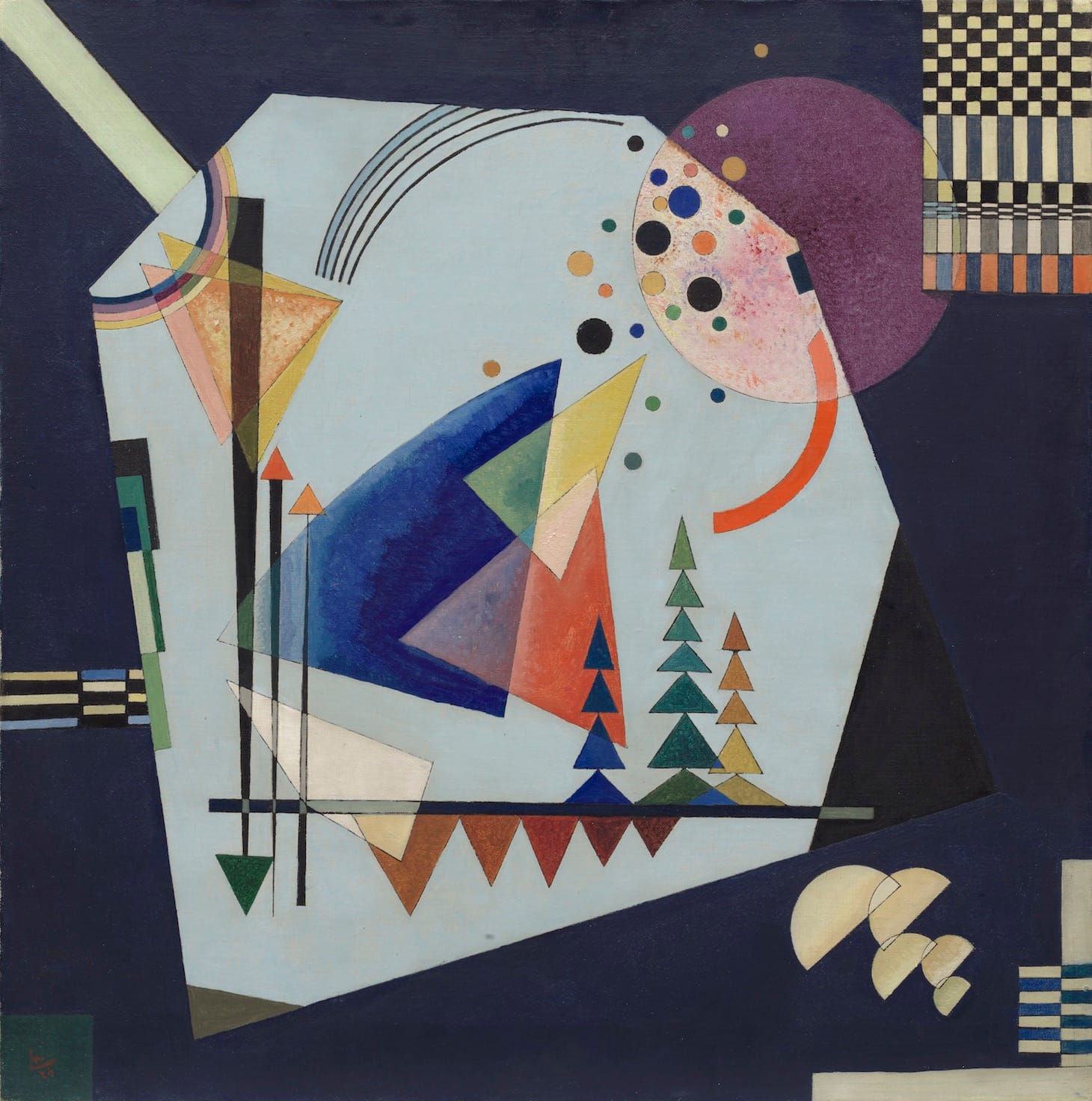 As the catalogue indicates, Kandinsky had a complicated career. Born in Moscow in 1866, he studied Central Asian ethnography and law in Russia before he moved to Western Europe in the early 20th century, living and working there (primarily Germany) until the Great War. It’s important, as art historian Reinhard Spieler has noted, that after a brief, unproductive stay in Paris, circa 1907, Kandinsky chose to paint in Munich. That’s where he formed the Expressionist art group Der Blaue Reiter (The Blue Rider) — and where he avoided having to deal with cubism. Then, immediately following the Russian Revolution of 1917, and after some frustrating art-world administrative work in 1921, he returned to Germany, where he played an influential role as a teacher at the Bauhaus. When Hitler came to power, in 1933, and closed that school, Kandinsky moved to Paris, where he died in 1944, just after the Allies liberated the city.
