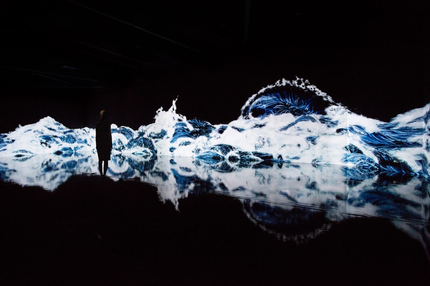 The magical reverie of “Black Waves,” a widescreen panel of animated Katsushika Hokusai-style waves, was lost in the crowd—oceanic contemplation works best without being immersed in a crowd of twenty. “Crows…,” a free-wheeling installation of flying birds, felt engineered for drama and display. It was all a bit too saccharine, like the maraschino cherry on top of a sundae. And though “Vortex of Light Particles,” an underwater whirlpool spilling from the closed skylight above created specifically for Amos Rex, was mesmerizing, as we stood aimlessly in the cavernous central space, it felt like the visual grandeur of it all had trumped the notion of guiding viewers towards reflection. I missed the beds the New Museum had offered for Pipilotti Rist: Pixel Forest back in 2016, which had turned that experience into both a visual and spiritual delight. There was none of that here.