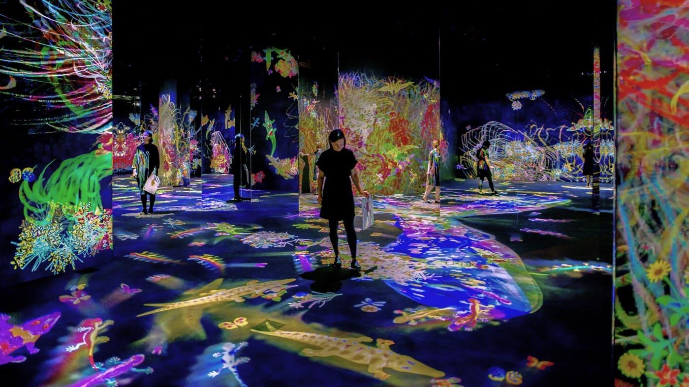 But “Graffiti Nature: Lost, Immersed and Reborn” (2018), an interactive labyrinth teeming with digitally projected wildlife, knew what it was dealing with: a crowd, some of whom may have had Instagram on their mind. When we held our hands to the wall, flowers bloomed. We colored in birds, making our oil pastels blunt, then scanned our drawings and watched them come alive as they joined the projected throng. We jumped and stomped like five year olds on crocodiles and lizards. This was how Alice must have felt, falling down the rabbit hole into a strange sense of wonder.