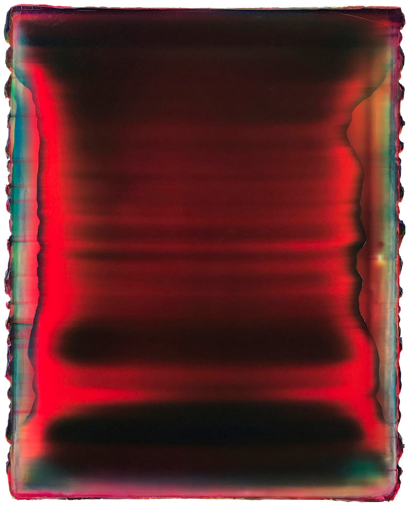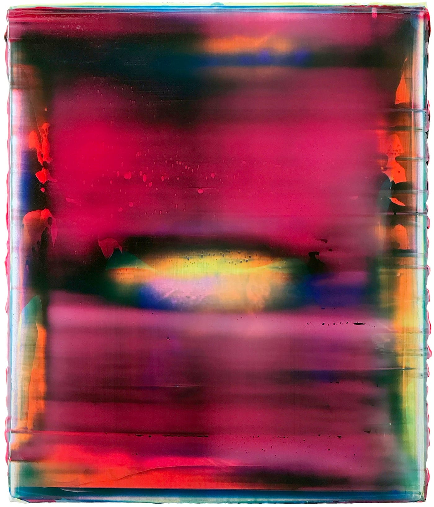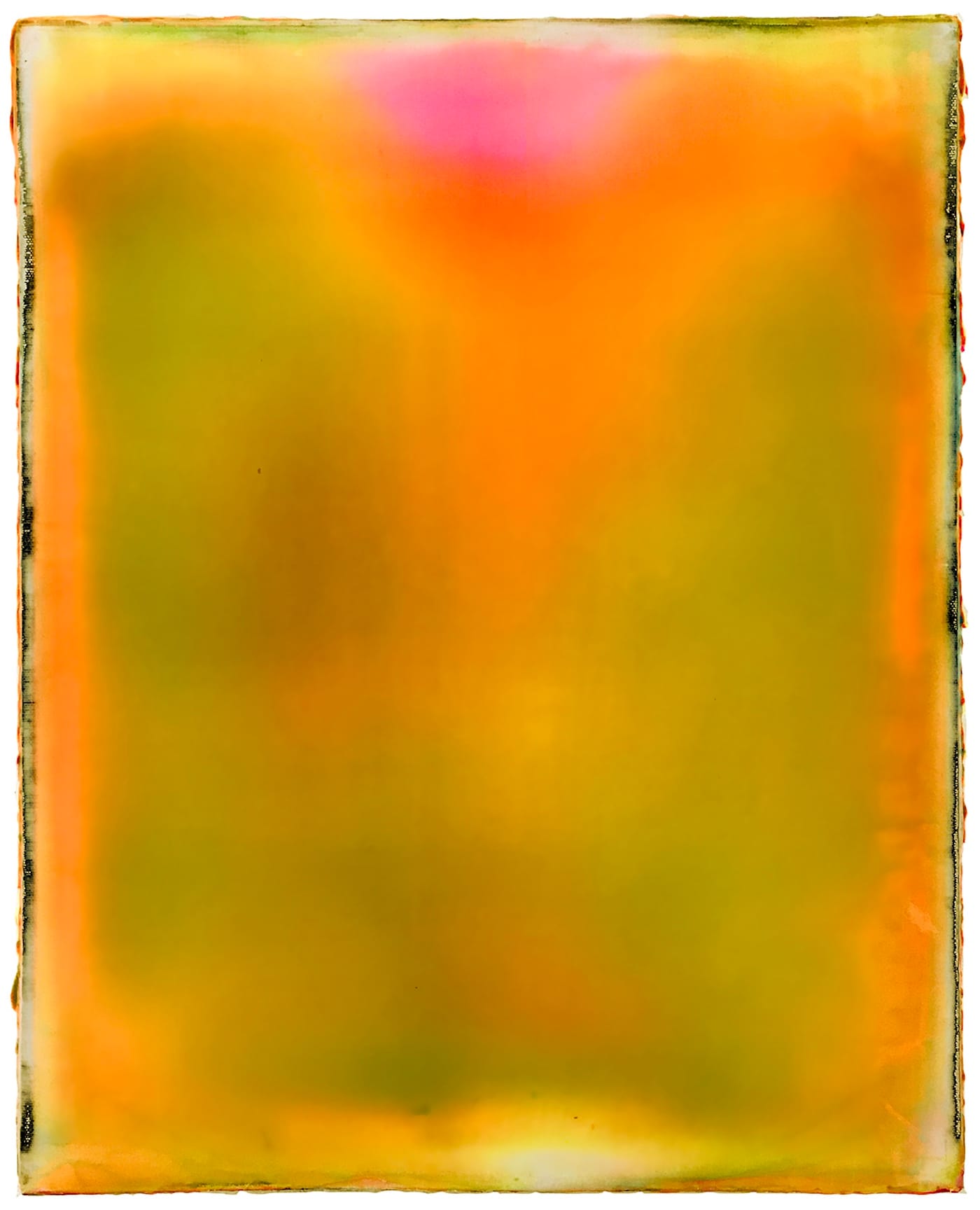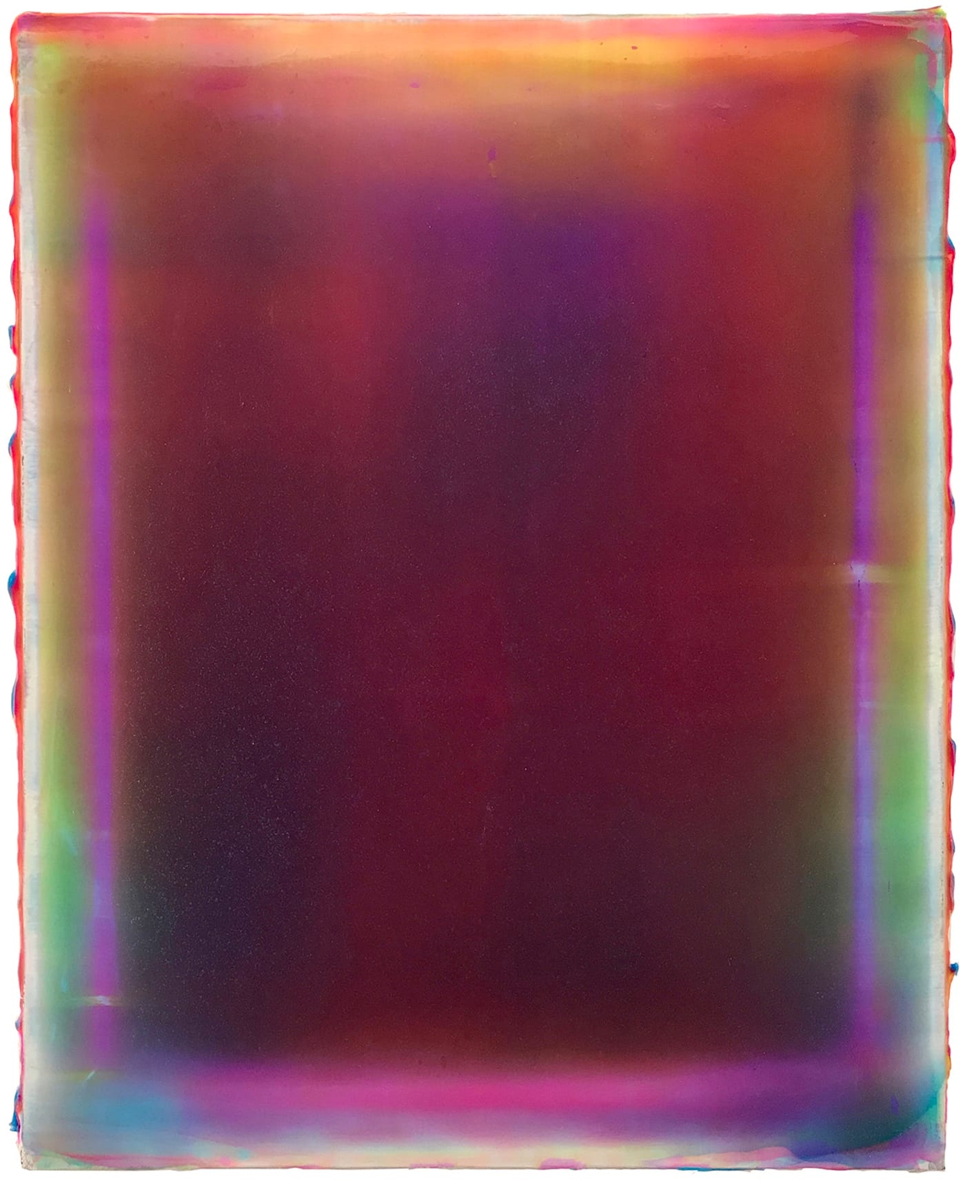 The paintings (and therefore also the swipes) are oriented vertically. In “Murmur” (20 by 16 inches, all works 2017), peripheral traces of emerald, amber and violet roughly frame a central region in which those hues mix and partly neutralize one another — a subtly shifting pool of variously concentrated colors, yielding tones approximately those of green tea, maple syrup and grape jelly.