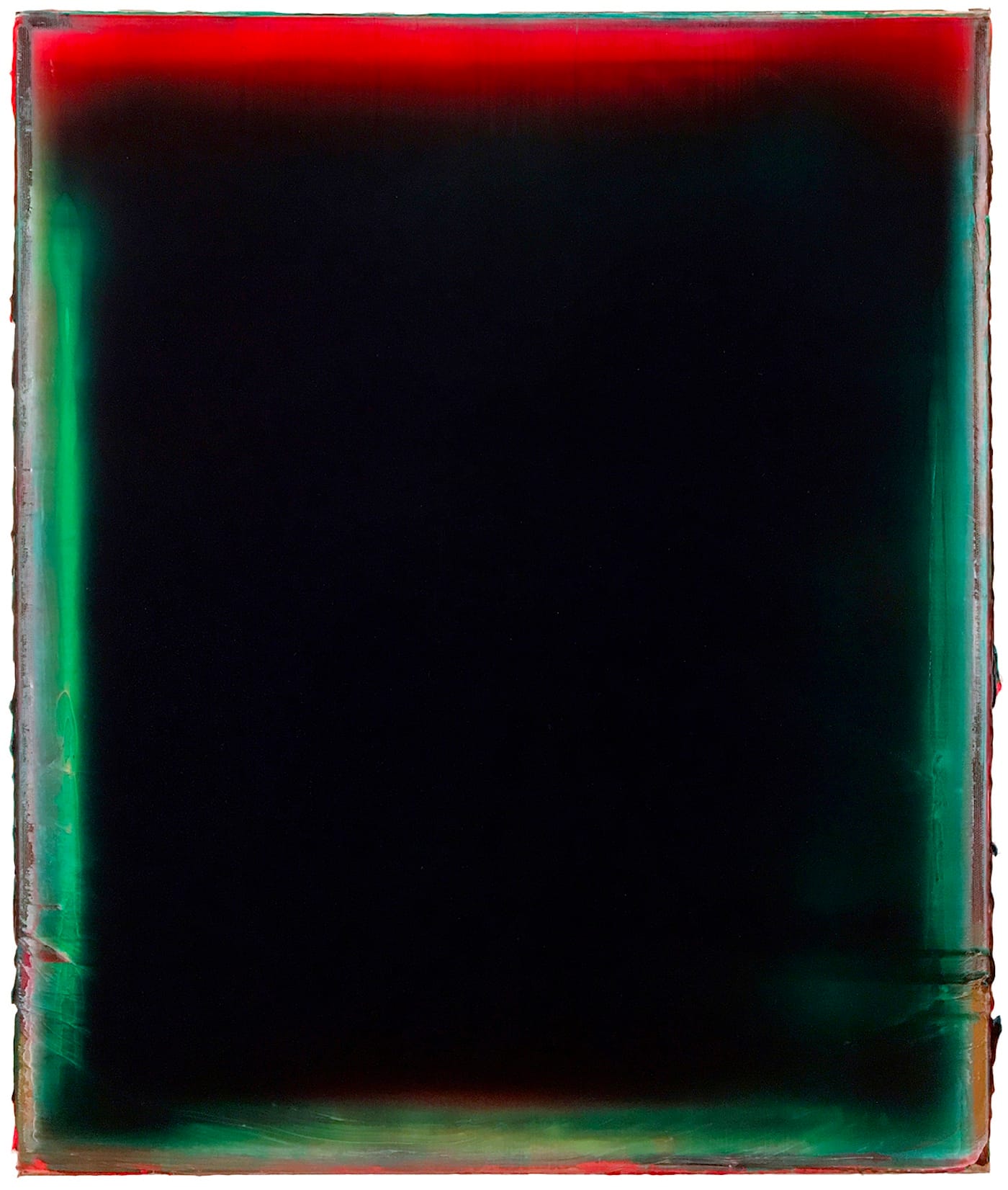 In some cases, that glow is limited to the edges, where the stretcher bars leave their imprint. Santa-suit red and holly-leaf green appear around the margins of “Light My Path and Lead Me Astray” (24 by 20 inches), blending in the maw of the painting’s center to a sooty, lump-of-coal black. Gallery owner Jared Linge, tongue in cheek, delights in calling it the most depressing Christmas painting ever, and it’s true that the seasonal associations of the palette survive even this treatment.