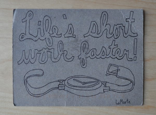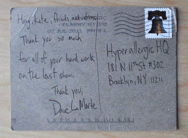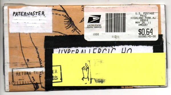 I suppose the best part is that the fun didn’t end with the closing of the show. Mail art has continued to arrive at Hyperallergic HQ. With the added element of internet communication, I discovered that my friend (artist, Doodle Drag founder and rockstar superhero) Marissa Paternoster had, in fact, submitted mail art for our show that suffered the errs of the postal system. Her pieces were marked “return to sender.”