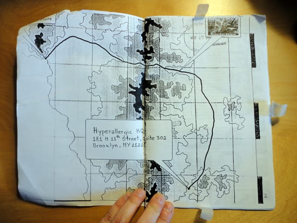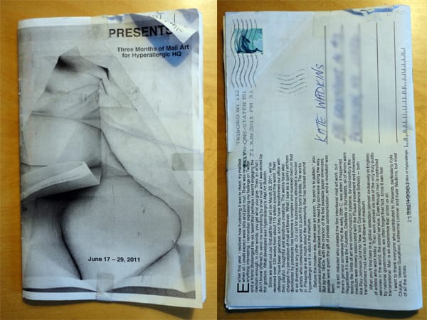 It’s been nearly a month since we dismantled our mail art show, Presents: Three Months of Mail Art for Hyperallergic HQ, here at Hyperallergic. The show was a first in a lot of ways: me and Hrag’s first collaboration, Hrag’s first zine-making experience and my first time curating a show outside of my own initiatives.