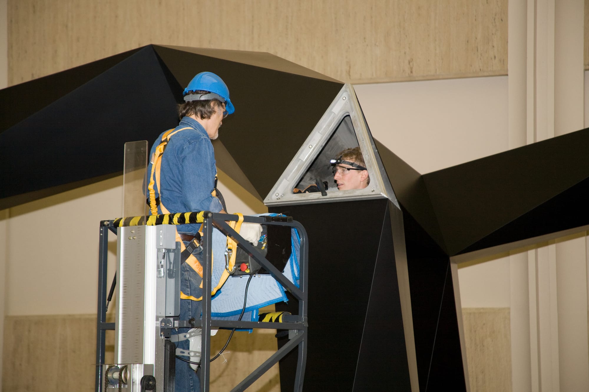 “Smoke” is bolted together from the inside, so that no seams or signs of its construction are visible. This means that installers have to crawl around inside the hollow structures, some of which are equipped with ladders. Lippincott hired Adam Swisher to work on the install team at LACMA. Though Swisher did not have an art background, he had experience as a skilled spelunker — a cave explorer — and was therefore comfortable navigating narrow, dark spaces.