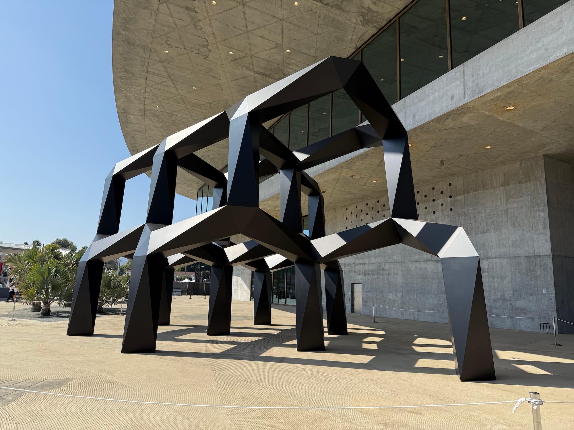 In 2005, Lippincott, a Connecticut-based metal fabrication company, created the final aluminum version, which was installed inside LACMA’s now-demolished Ahmanson building in 2008. Its hulking form dominated the central atrium. (It is Smith’s largest sculpture originally conceived for an interior space.) In its current exterior site — roughly 10 feet from its original home in the Ahmanson — its presence is somewhat diminished, dwarfed by Zumthor’s concrete and glass edifice. The sculpture's new placement does allow for a more dramatic range of light effects, however, as the play of sunlight on the black planes and the shadows cast underneath change constantly throughout the day.