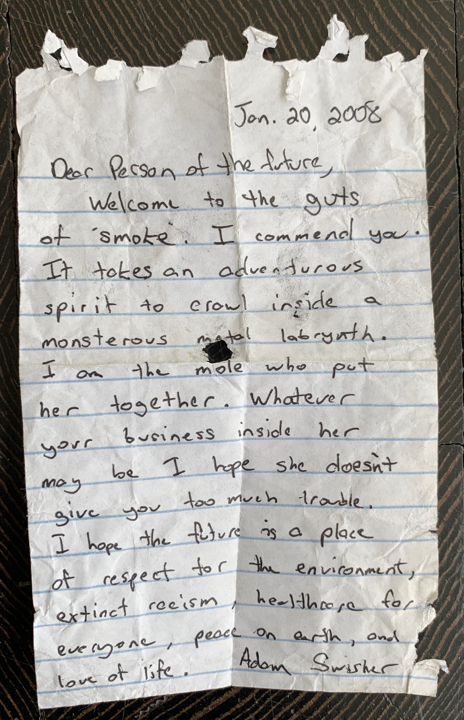“Maybe it was discovered before its time, before some of those things came to fruition … That’s a little bit disconcerting,” Swisher told Hyperallergic, reflecting on how much — or how little — the world has changed in the 17 years since he left his note inside the warren of aluminum tubes. “I still stand by those words. Maybe I’m just an eternal optimist.”