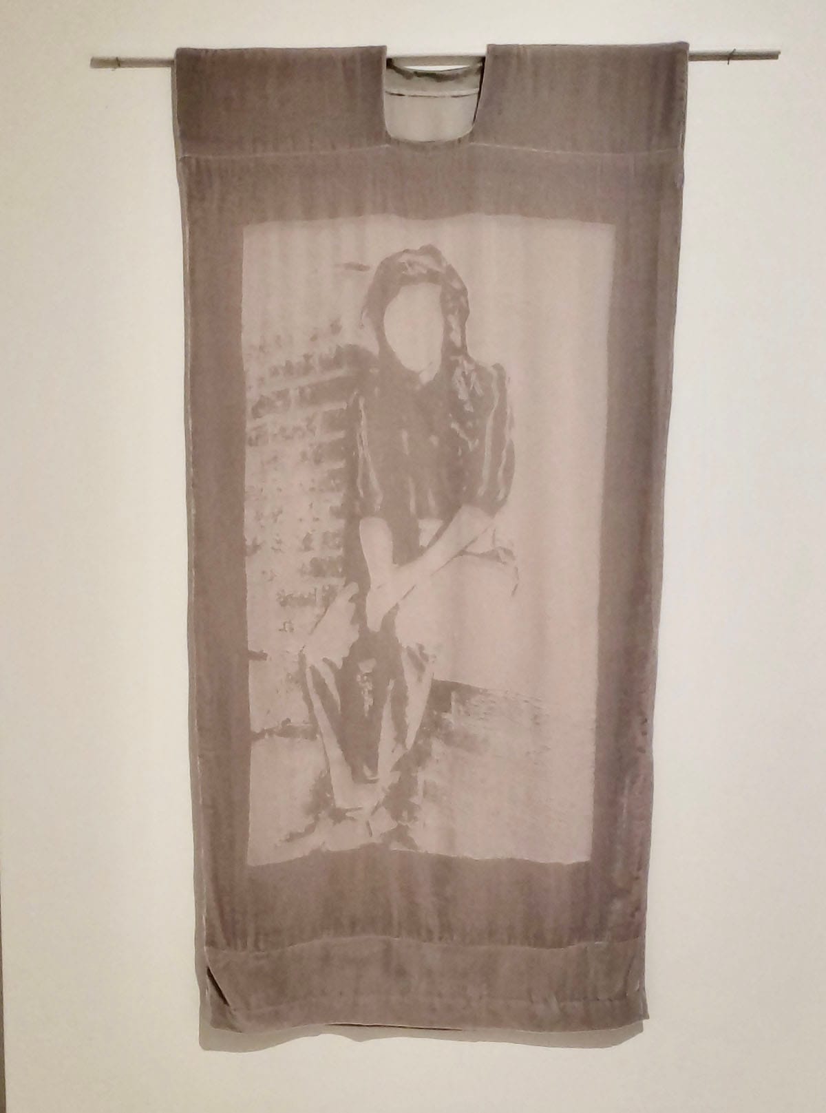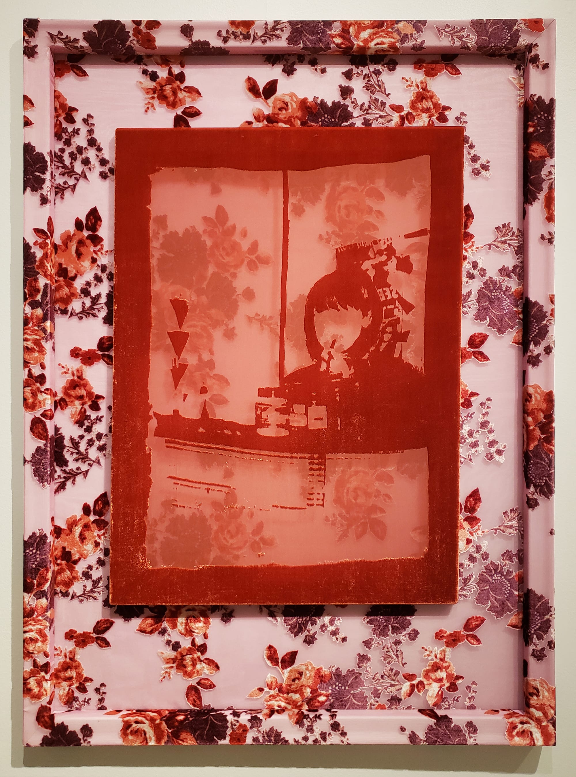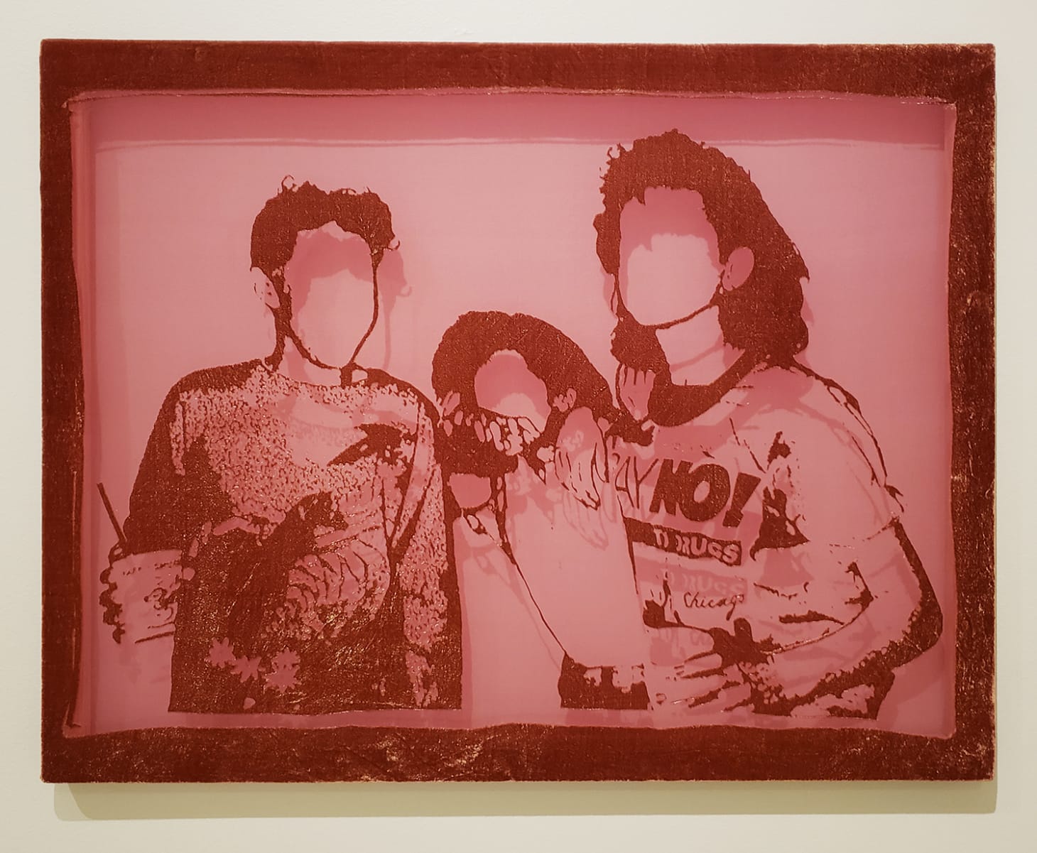 The velvet portraits are taken from photographs featuring tween and teenage Yemeni girls, each comfortable in their own company. While the archetype for youthful female friendship in the US is fraught with mean girl tropes, common cultural practices of Yemeni immigrant populations often place young girls and women under restrictive and punitive surveillance, making the solace of female companionship sometimes the only space held for them to be at ease. These portraits are captured and relief-burned into rayon-based velvet, a material which Diaz employs to reference the 1990s (her own teenage years), as well as the Yemeni style of dress known as a dir’ — a kind of partially transparent caftan worn by married women.