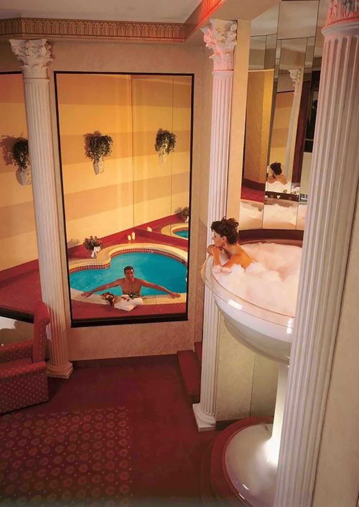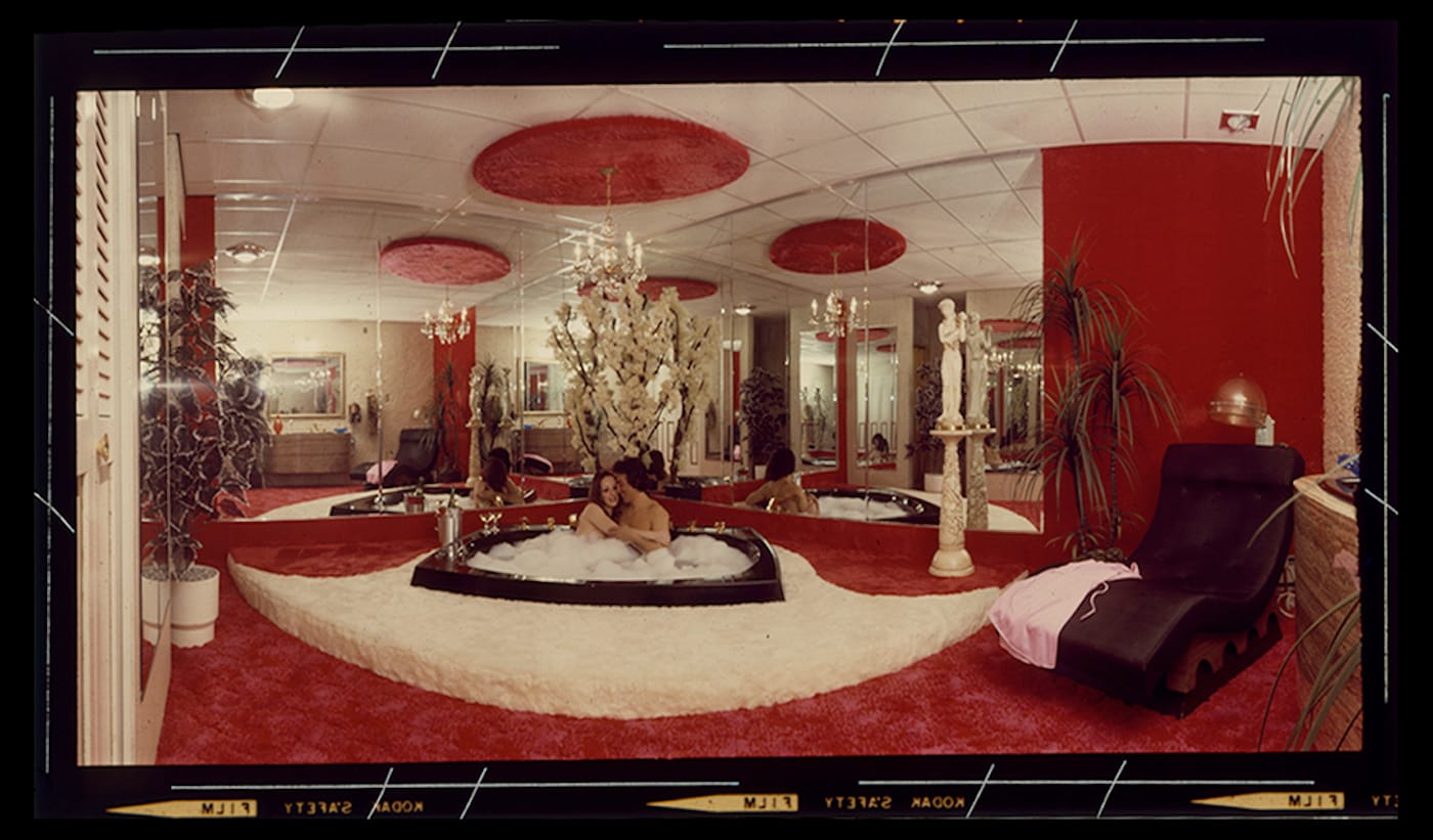 In a 1971 photograph advertising the “Roman Tower Suite” at the Pocono Palace Resort — a lakeside honeymooners’ retreat in northeast Pennsylvania’s Pocono Mountains — a woman lounges in a seven-foot-high jacuzzi tub shaped like a giant champagne glass. From her cloud of bubble bath, she gazes down longingly at a man in a heart-shaped pool below. Roses, candles, mirrors, faux Corinthian columns, champagne bottles, and wall-to-wall red carpeting adorn the couple’s private love nest, where they’re enjoying their sexcation of choice — perhaps a honeymoon, Valentine’s Day, or a romantic weekend away to ease the troubles at home.