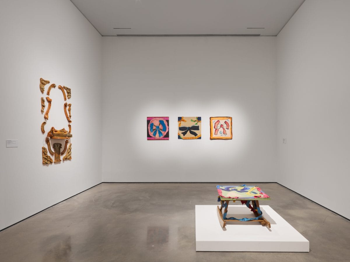 P&D was a hard-charging assault on traditions both ancient and oppressive. It was also an explosion of joyously liberated impulses. Schapiro was not afraid to arrange splashy, floral images in big, heart-shaped wall pieces overflowing with sentimentality. Kim McConnell, a male member of the group, felt no need to suppress his penchant for flagrant whimsy, nor did Cynthia Carlson fear that she might be accused of designing wallpaper. In fact, she did cover gallery walls with patterns that featured repetitive, brilliantly squiggling motifs, some in high relief. The Bard exhibition presents a recreation of an early Carlson installation, as well as a room filled with McConnell’s light-as-air wall hangings and vivaciously painted furniture.
