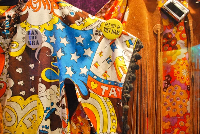 As the Democratic National Convention was met with riots in Chicago and across the country, 1968 marked the explosion of radical protest and the unique style of hippie culture, especially in San Francisco. The exhibition showcases the hippies’ colorful garb, as well as the average American family’s much more conservative aesthetic. Seen side by side, the pairing emphasizes the powerful disconnect between the hippie youth and the more conservative adults, although whether the hippies made a truly radical break remains ambiguous.