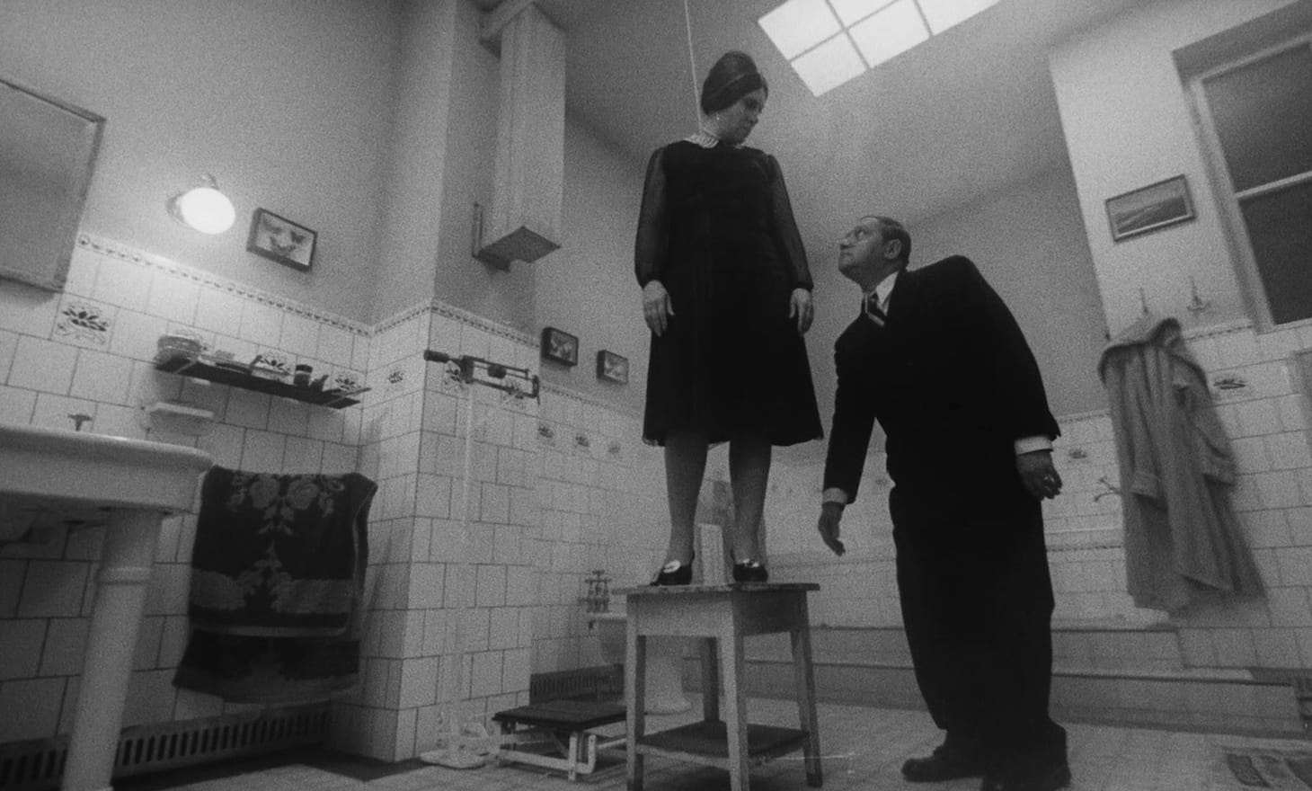 Early films like The Cremator (1964) and Sign of Cancer (1966) brush the elements of horror onto social and political narratives. The Cremator displays Herz’s most consciously stylistic editing, whereby cuts are cleverly used to form the illusion of traveling between time and space. Phenomenally crafted, the film creates a disorienting impression of its central character Karel Kopfrkingl (Rudolf Hrušínský) slowly but surely becoming radicalized by his German friend Walter Reinke, towards ethno-nationalism. The Cremator’s discomfiting humor — think the Cheshire Cat, mixed with elements of Peter Lorre’s performance in Fritz Lang’s M (1931) — turns a satirical eye to the absurdity of nationalist rhetoric.