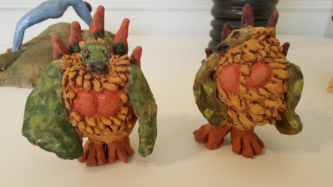 Interspersing new artwork among the original Nut pieces proves very successful. Particularly well-done are ceramic sculptures by Sally Saul, wife of painter and sculptor Peter Saul. Her “Sagehens” practically collude with the original Nut pieces. They are the stuff of dreams, characters in an alternate reality seeping through into our own. The Sagehen on the right turns to its compatriot, who stares straight ahead and gives the impression that they are executing some mischief. They are well-placed alongside Gilhooly’s “Classic Frog Pot,” Betty Bailey’s “Goddess of Nut” (1972) (an on-the-nose homage to the longevity of Nut), and Peeples-Bright’s fractal yet kindly monsters in “SeaSaw Beasts” (1965).