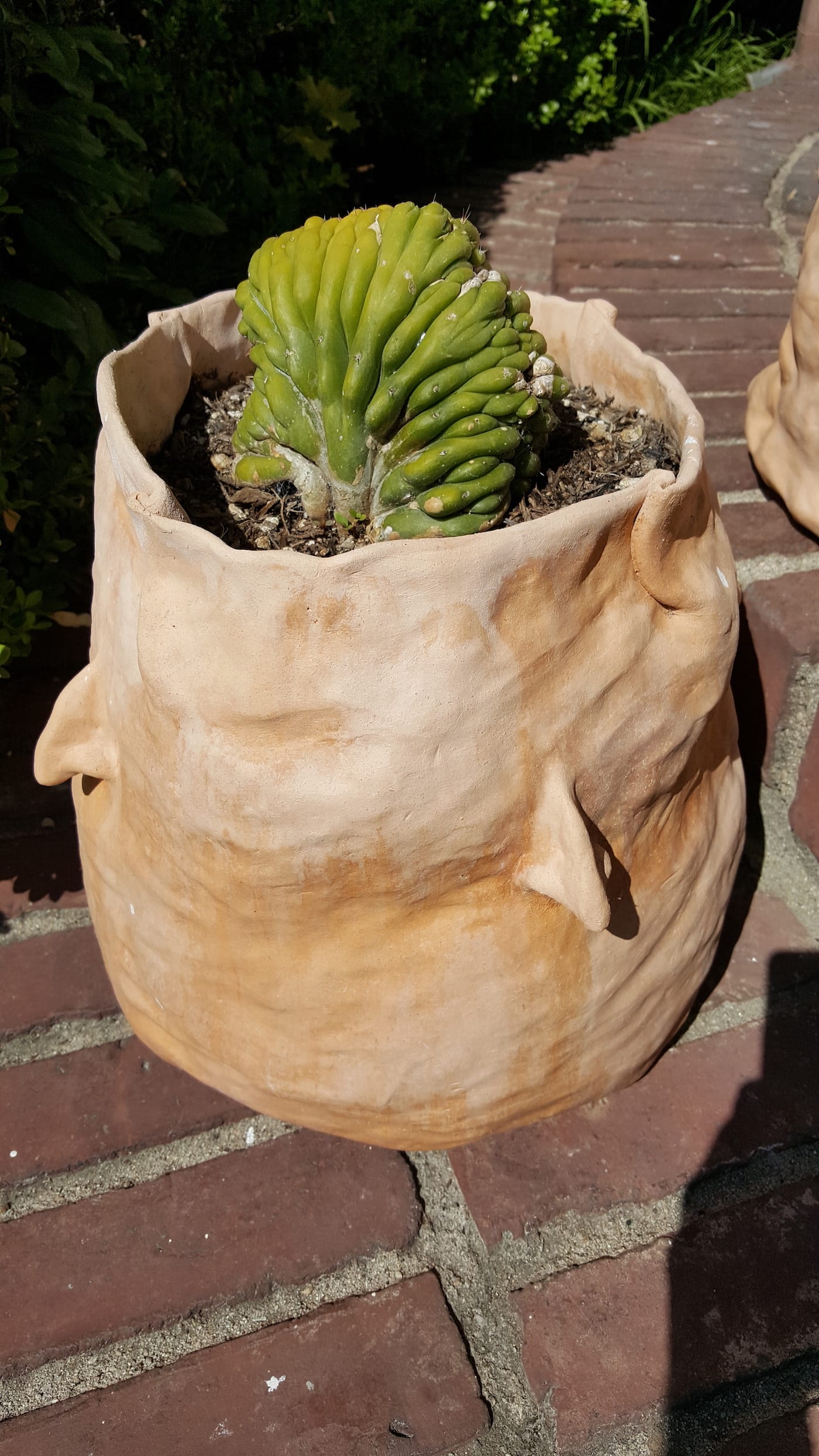On the steps outside the gallery (occupying the first floor of Parker’s home) are six pots by Calvin Marcus, each officially titled “Untitled” (2017). Marcus’s ceramic is so supple it appears made from human skin, or at least some kind of pig leather. The pots are planted with San Pedro cactus, which can be made into mescaline. Excess water drains away through four noses spaced evenly around each piece. The pots sweat with the phantasmagoria described by De Forest and are cloaked by Bailey’s twisted humor, as if one of Dr. Gladstone’s blob creatures reproduced with Bailey’s “Two Face Jug” (1990).