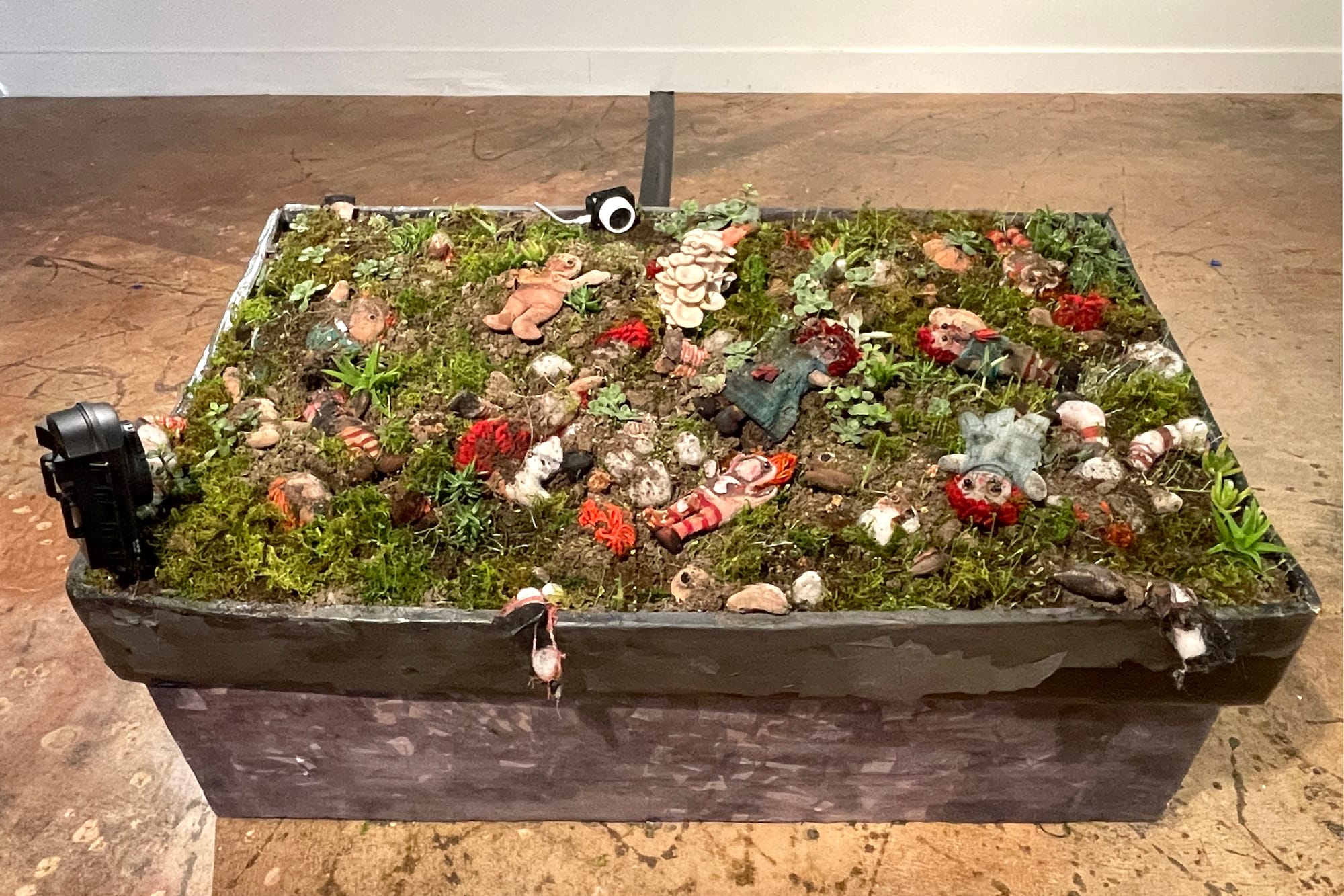 Though the artists’ anger can be felt in the exhibition, there are moments of tenderness. Marsian De Lellis scattered live ladybugs around their sculpture “(In)/Animate Objects [Burial + Rebirth]” (2025), which embeds handmade dolls into a bed of soil, plants, and mushrooms. The dolls will erode and be taken over by fauna, a hopeful reminder that this period of adversity could lead to stronger, healthier possibilities.