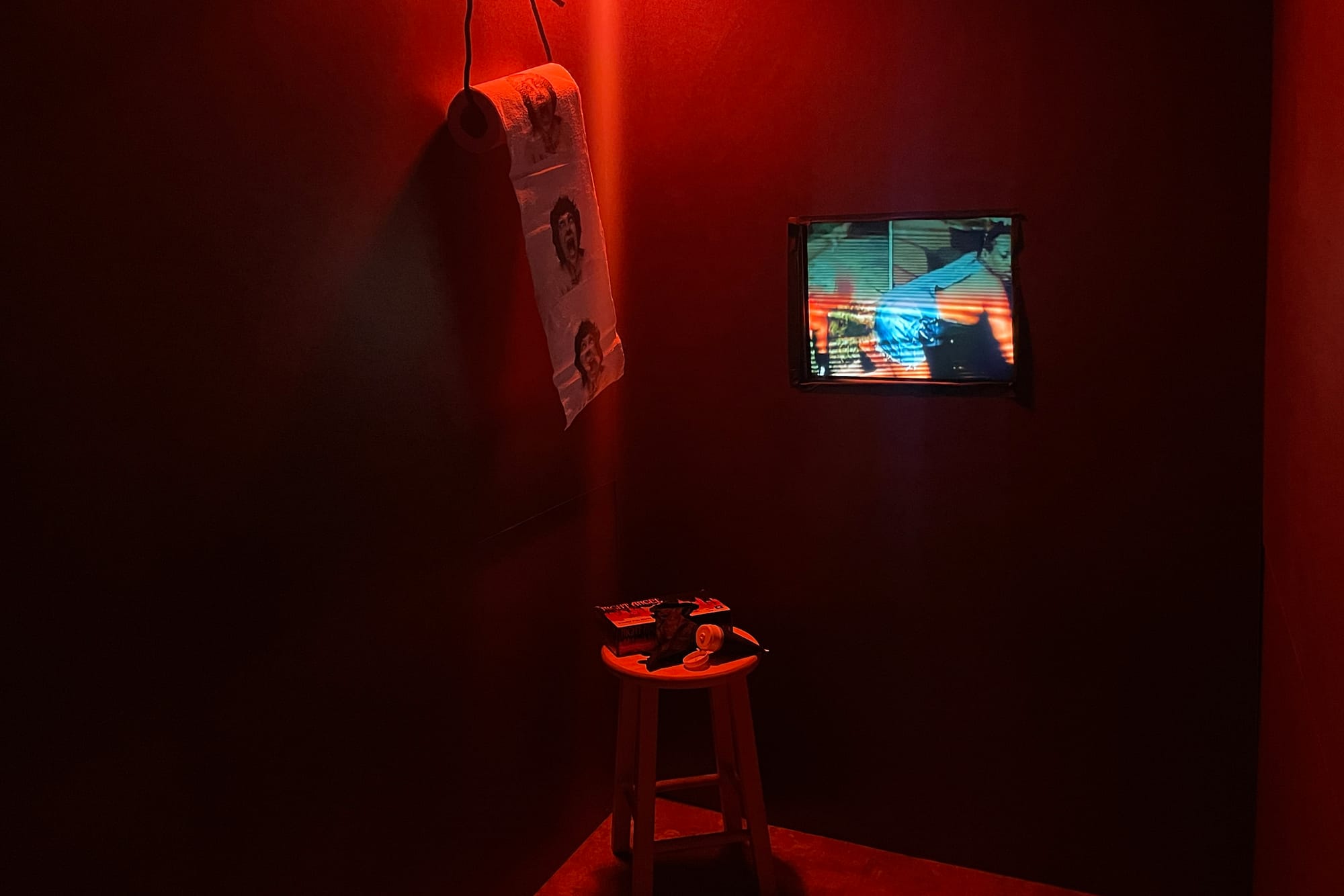 Other artists seem to want to push their conservative and religious adversaries' buttons via installations and compositions that some viewers may read as sexually explicit or sacrilegious. Amina Cruz’s “SPIT” (2024), a narrow enclave bathed in red light, has the ambiance of an illicit backroom in an old-school video store. Porn plays on a screen warped by moiré lines, and a stool conveniently offers up latex gloves and lubricant. A roll of paper towels, screen printed with Cruz’s howling face, could be interpreted equally as an orgasm or a cry of despair, the latter an appropriate reaction to the current political climate. Next to Cruz’s installation are a cluster of paintings and drawings by Ruby Zarsky that portray anime characters with enormous penises. “Madonna” (2024) depicts the Virgin Mary with an erect cock and semen dripping off her shoulders. It may be Zarsky’s means of retaliation against the religious zealots stripping away her rights, or perhaps it expresses the fluidity of embodied gender.