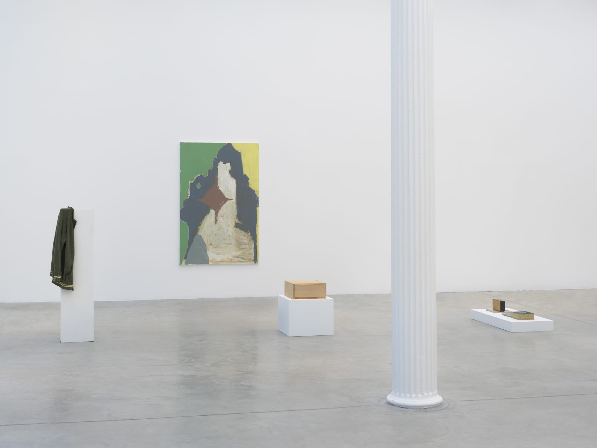 Aldrich similarly invokes and displaces a human presence in the anthropomorphic installation “Portrait of Olivia in Three Colors, All Olivia” (2017), a moss green cardigan draped on an indented white pedestal, and a mystical presence in “Box” (2018/2005), a natural plywood box, atop a white pedestal, emitting a glimmer of light at its base.